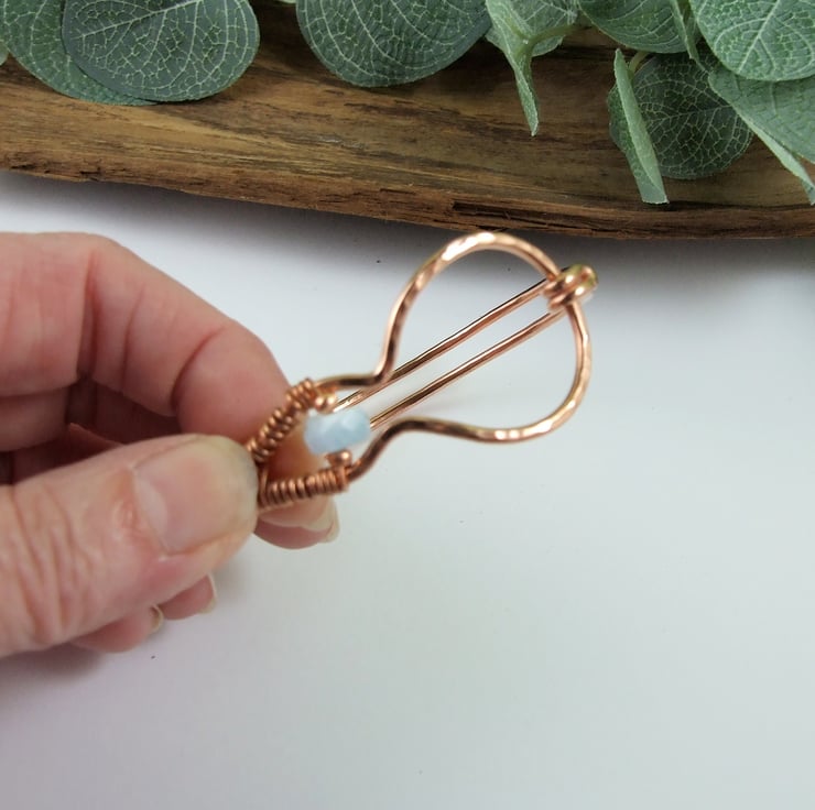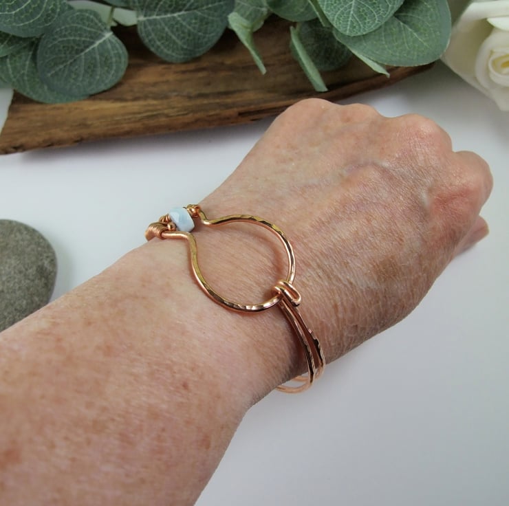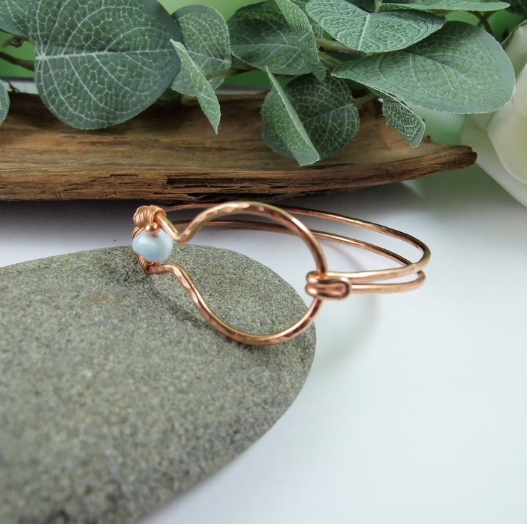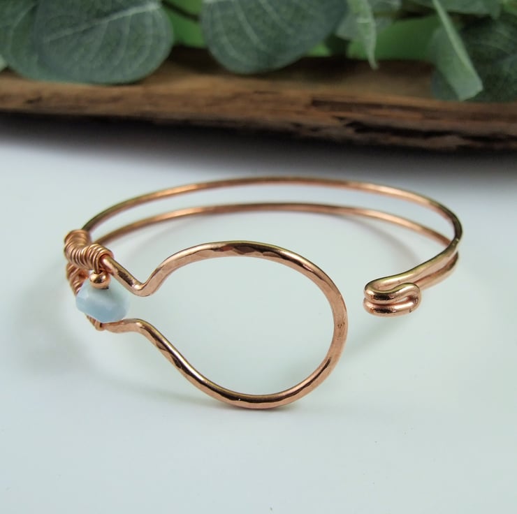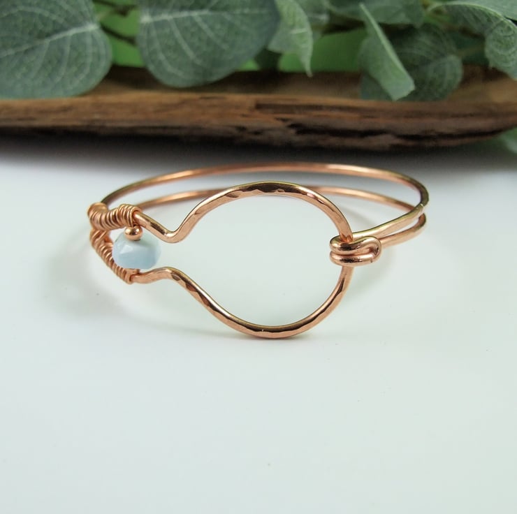 I have made the bangle from 2mm solid copper wire which I have doubled over and shaped into a freeform design. To this I have added a small 4mm pale blue amazonite gemstone and some tiny copper beads securely and individually wire wrapped in place.