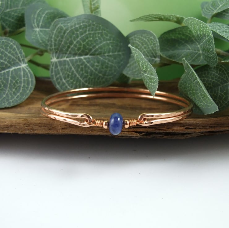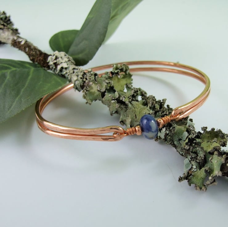 I have made the bangle from 2mm solid copper wire which I have doubled over and shaped into a freeform design. To this I have added a small 6mm sodalite gemstone and some tiny copper beads securely wire wrapped in place to form a complete bangle.