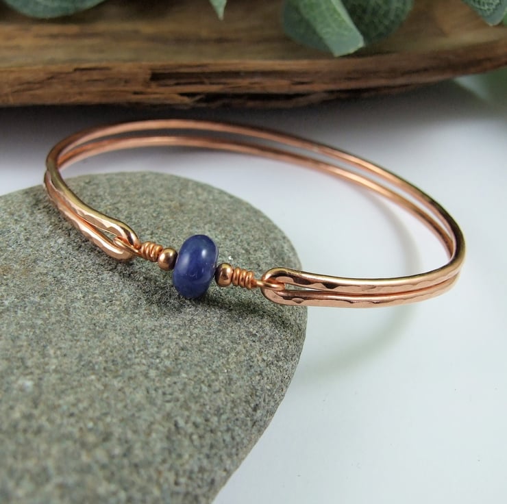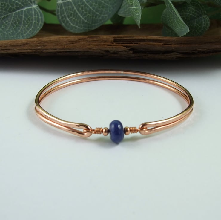 Hand forged Copper Bangle with Sodalite Gemstone wire wrapped in place. Size Medium 20cms circumference.