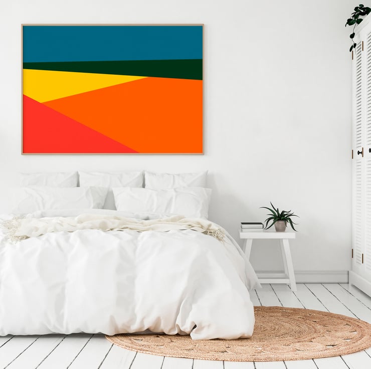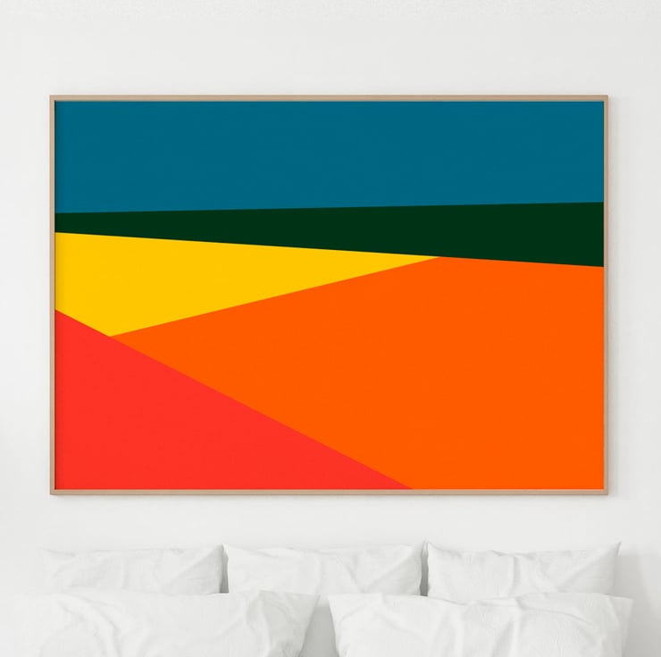 The "Tulip Fields" design is a modern interpretation of these iconic flower fields, blending geometric shapes and vibrant colours to create a visual masterpiece. Bold lines and angles intersect to form an entrancing pattern that captures the essence of these enchanting landscapes. The dynamic arrangement of tulips in reds, orange, yellows, green and blue adds a touch of whimsy and cheerfulness to your space.