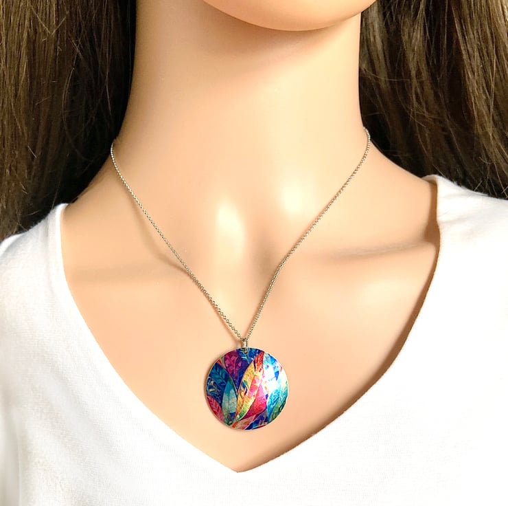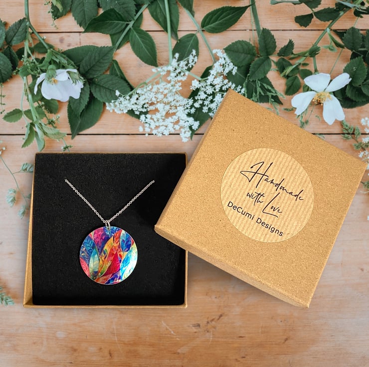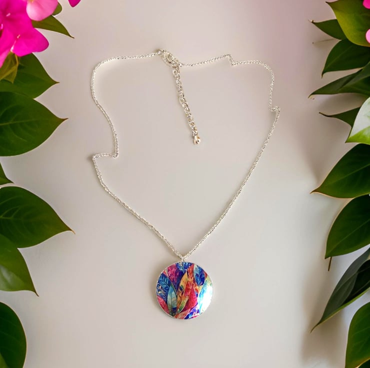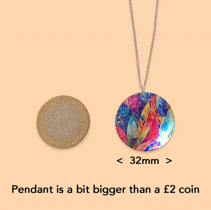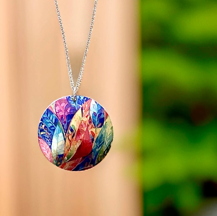 This is a disc pendant which I have handmade with a colourful leaf design. Matching earrings and bracelet are available.
