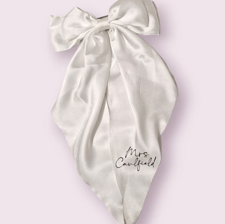 Available in white or ivory satin, this clip can be personalised with a name, surname, "mrs ...... to be" etc.....