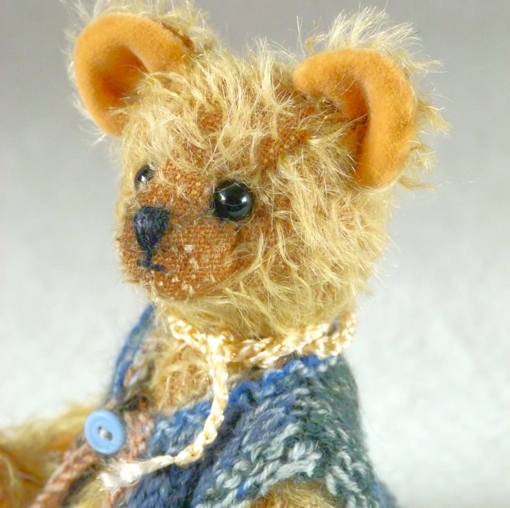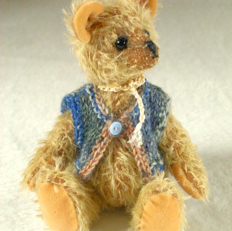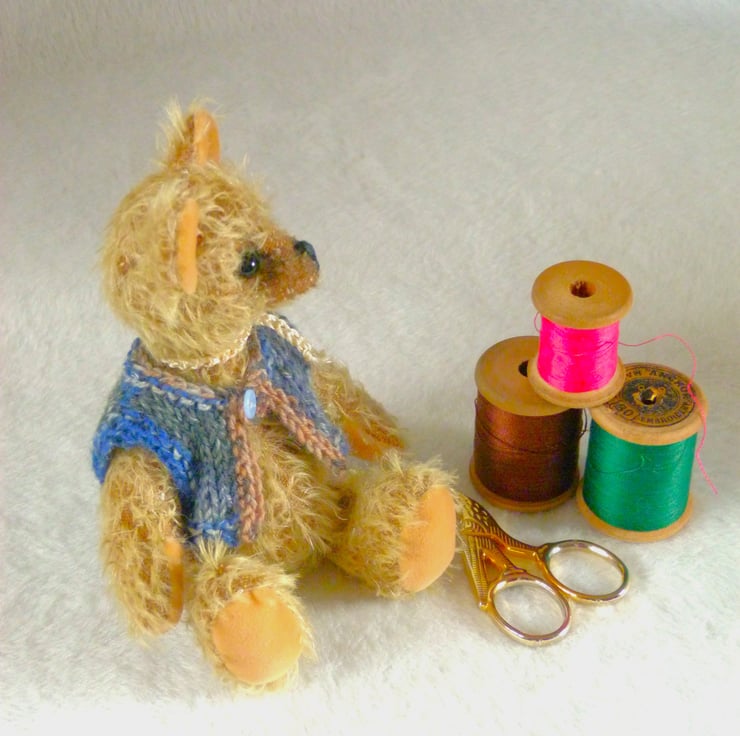 I love to make different sizes and styles of bear and this piece of mohair was just right to create Woody. I look at the fabric and the bear emerges.