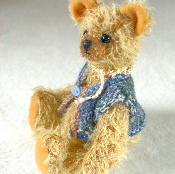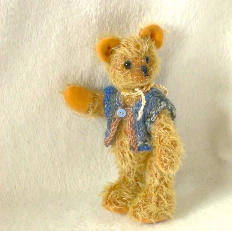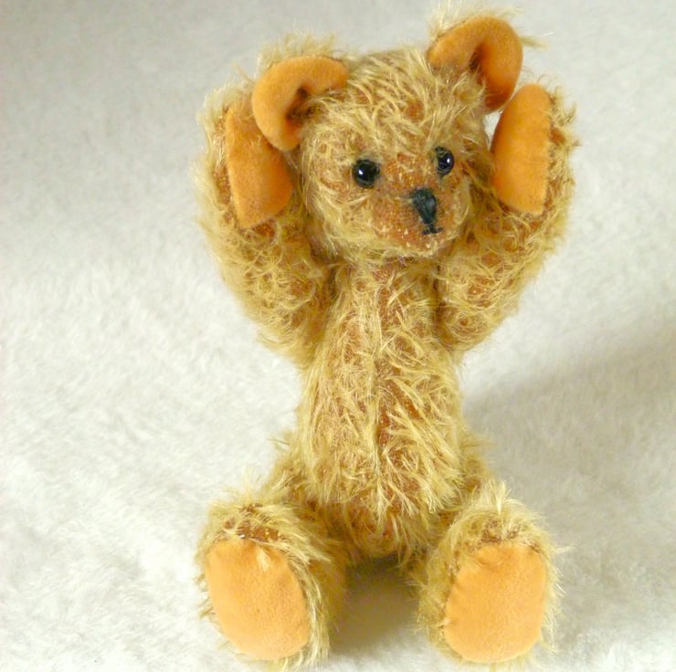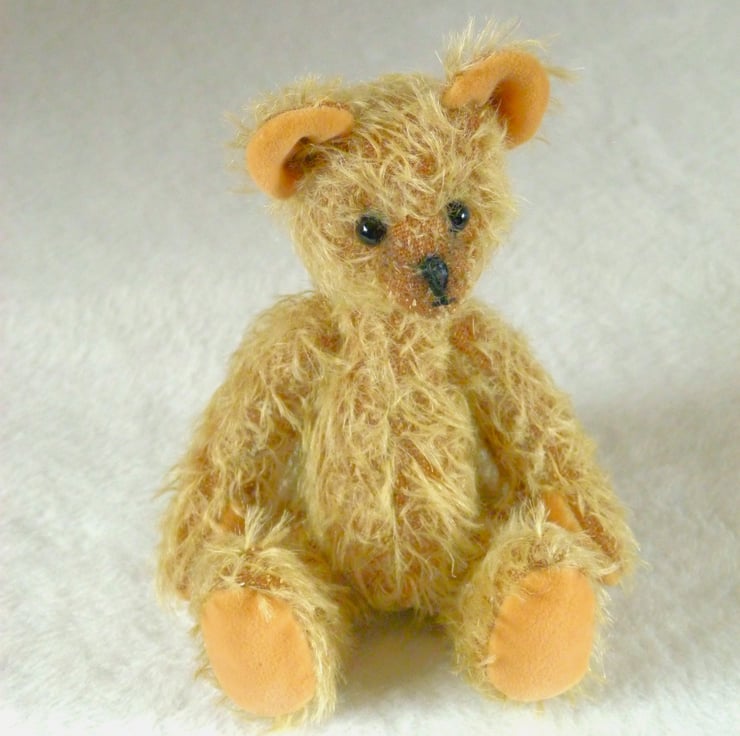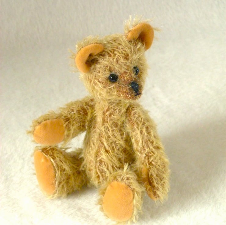 Woody is made from pale gold, Steiff Schulte Mohair which gives him a lovely ' old bear' look. His paw pads and ears are in a contrasting yellow cotton velvet. There is a cotter pin joint to move his head and his arms and legs are thread jointed.