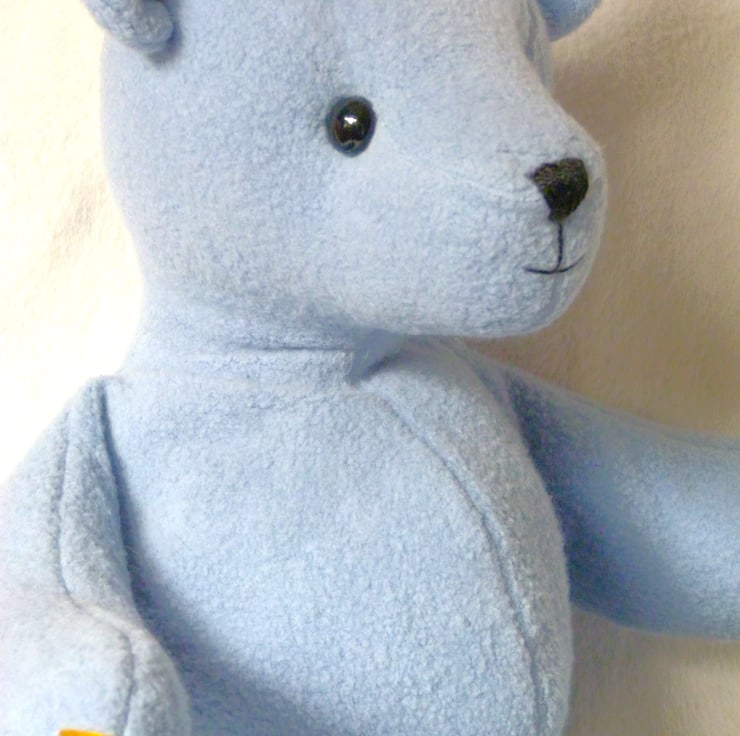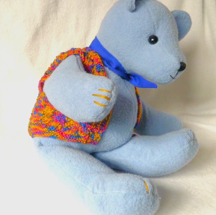 Stilton is a large bear at 20" tall and is made from lovely soft cotton fleece material. He is unjointed and very squishy, sort of half way between a bear and a cushion! Loves a good cuddle.