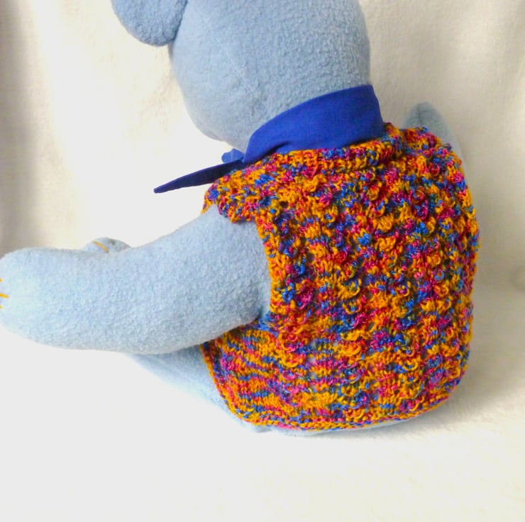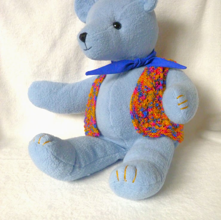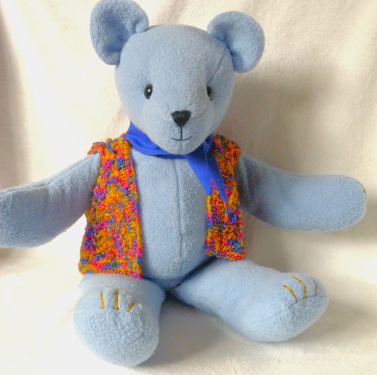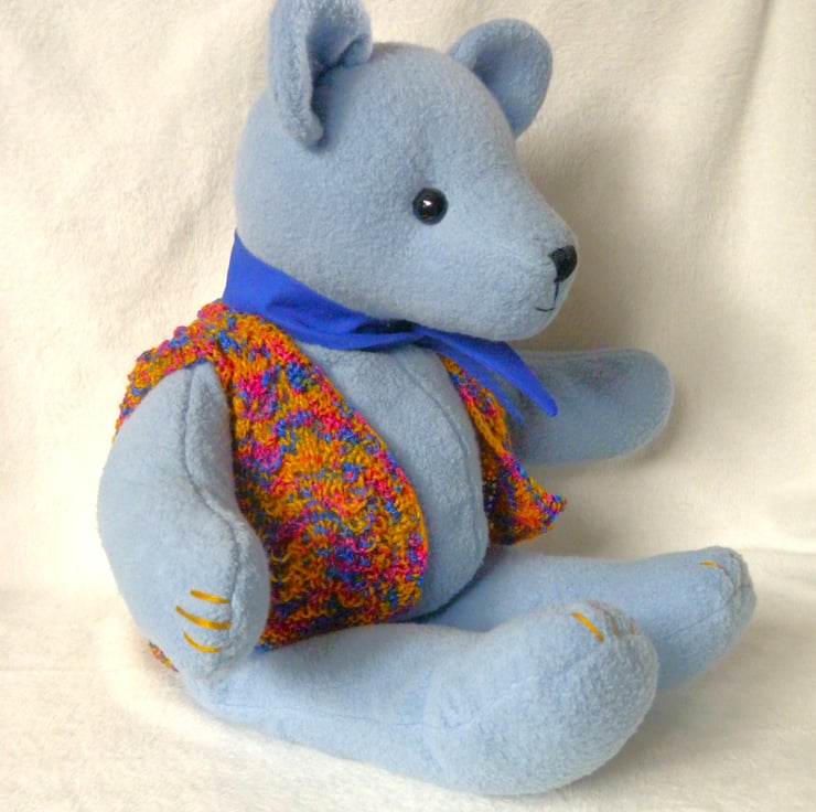 Stilton, a big, blue hug of a bear with a knitted waistcoat.