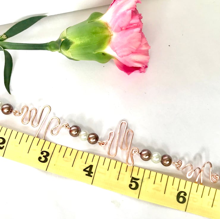 This bracelet has been made with excellent quality tarnish resistant jewellery wire with a beautiful swirl. Beautiful taupe and white glass pearl beads. Very eye catching bracelet measuring -approx 7.5”. I am happy to make another in the size you would like, same price applies.