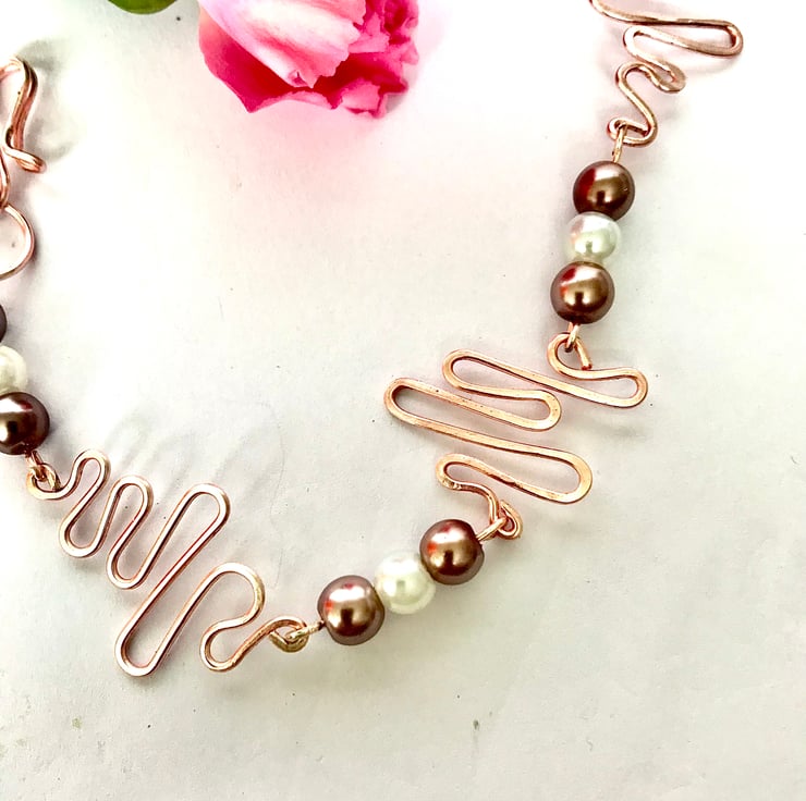 This bracelet has been made with excellent quality tarnish resistant jewellery wire with a beautiful swirl. Beautiful taupe and white glass pearl beads. Very eye catching bracelet measuring -approx 7.5”. I am happy to make another in the size you would like, same price applies.