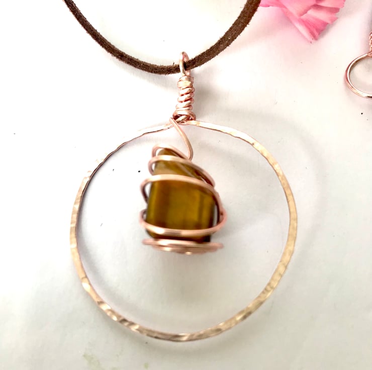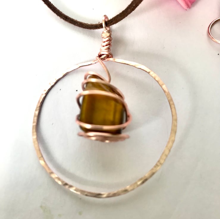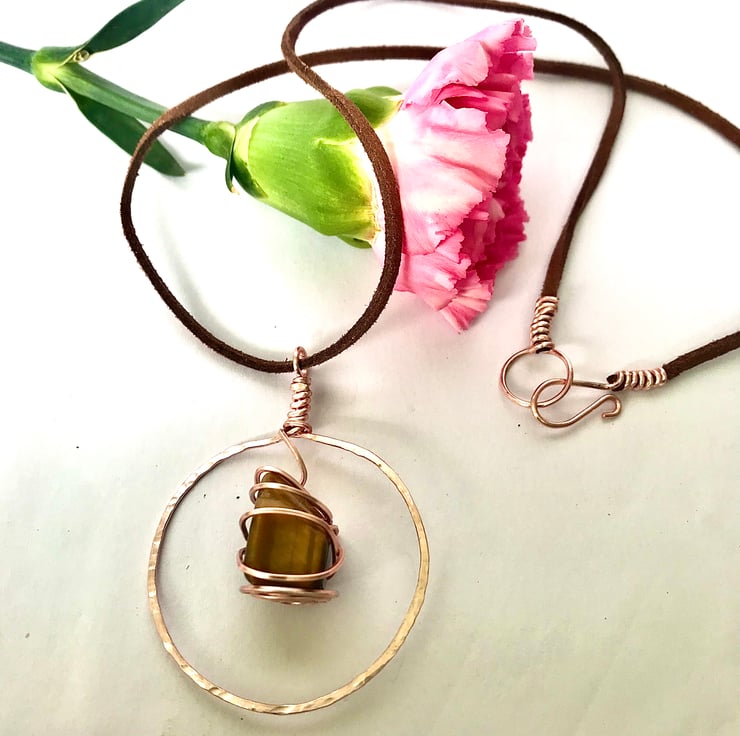 This necklace is made with high quality 1mm gauge anti tarnish rose gold plated jewellery wire and features a beautiful polished tigers eye stone. The pendant comes on a soft cowhide leather cord although this can be transferred to a chain of your choosing. To maintain the shine and quality it is best to avoid showering etc with it on.