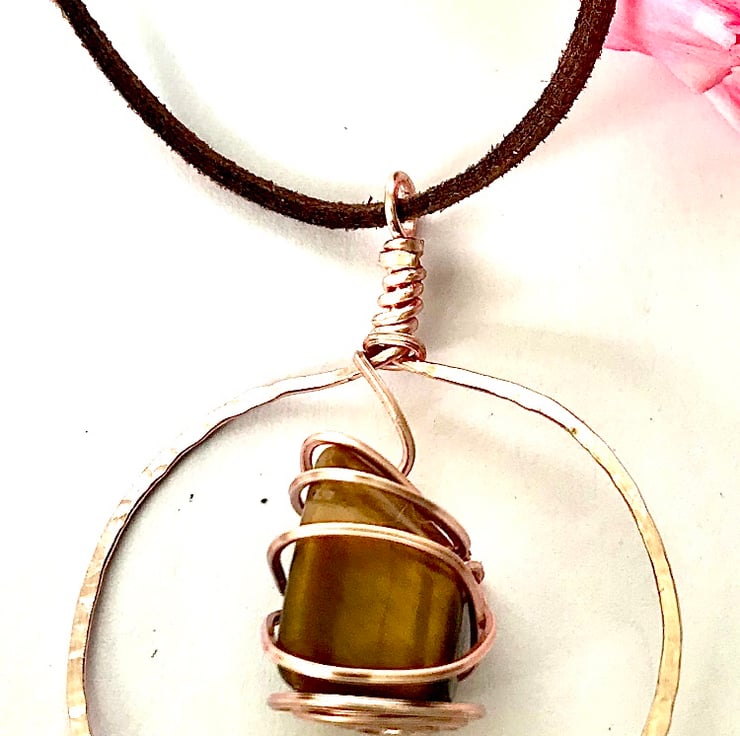 Tigers Eye Pendant - Large Stone Wrapped In Rose Gold on Leather Cord