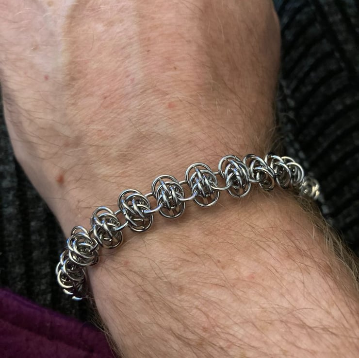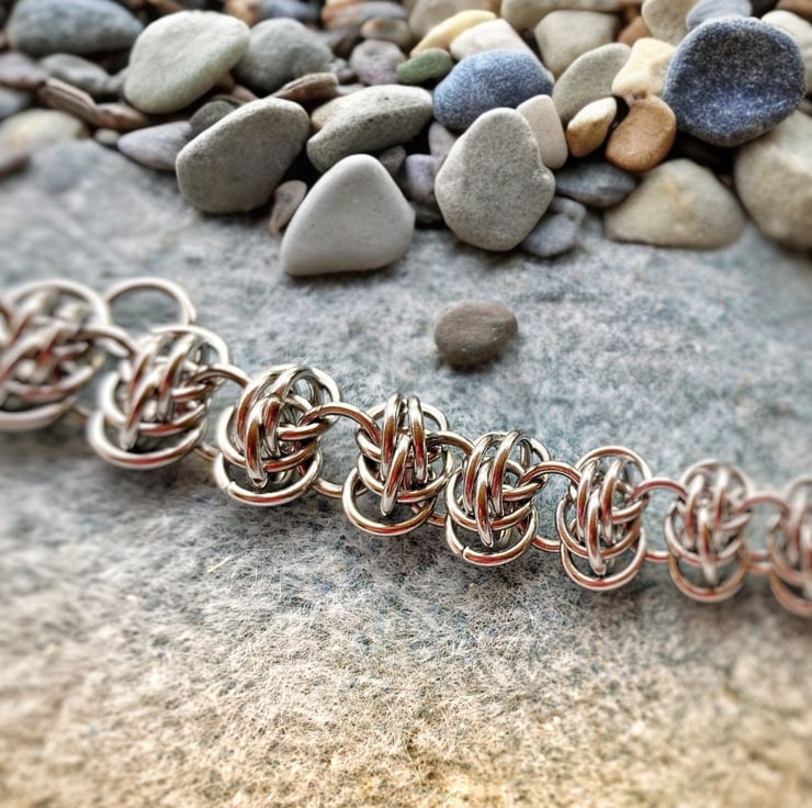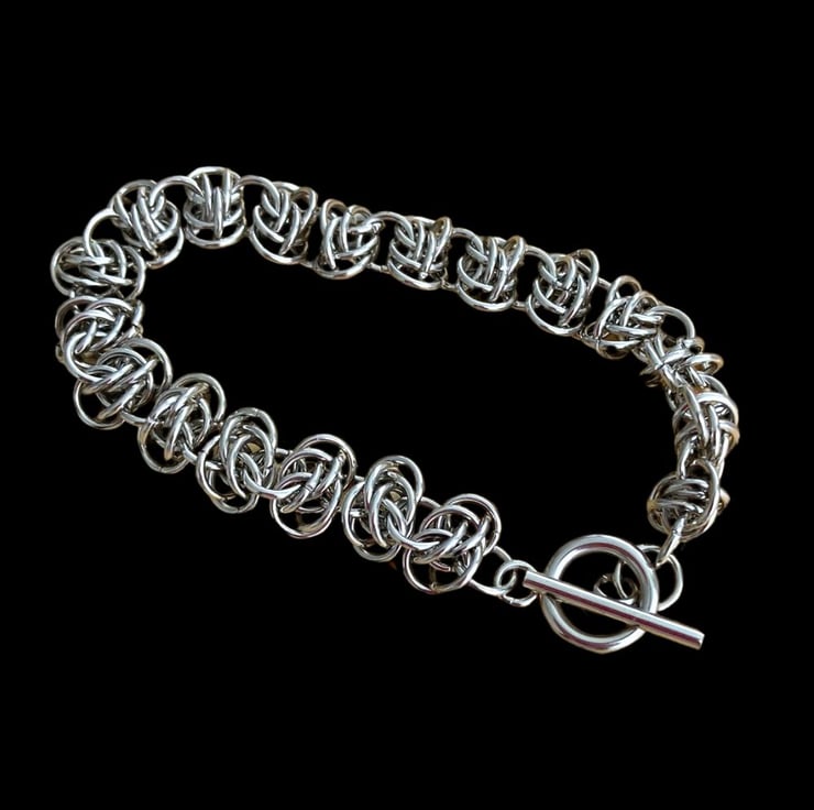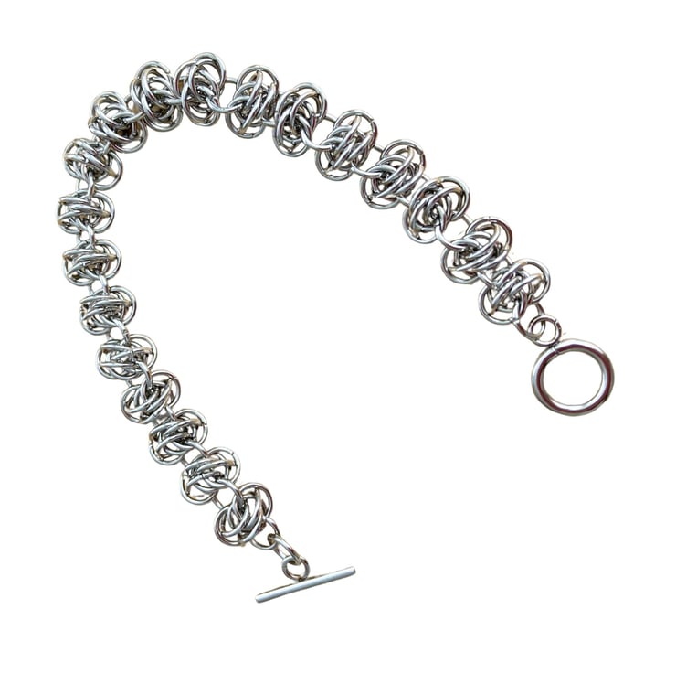 This beautiful unique piece of jewellery - is created with stainless steel rings woven together to form this bracelet and it can be completed with either a simple toggle clasp or the traditional lobster claw clasp.