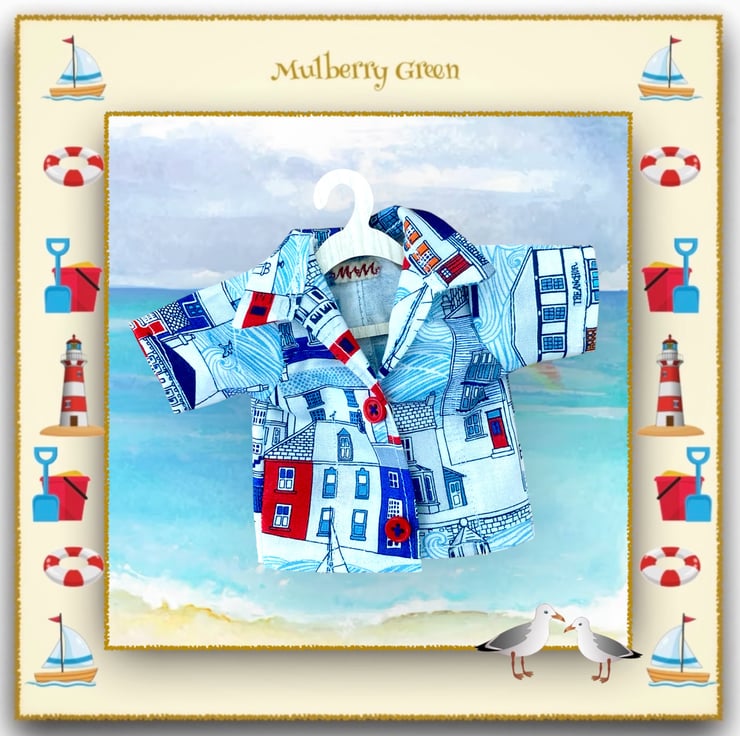 A cute little short sleeved shirt to fit the Mulberry Green characters. The shirt is made from best quality cotton in a little harbour town print and fastens with poppers underneath the buttons. It looks lovely with the cords or jeans.