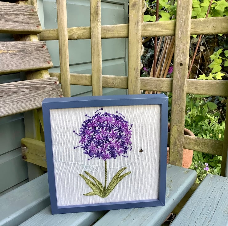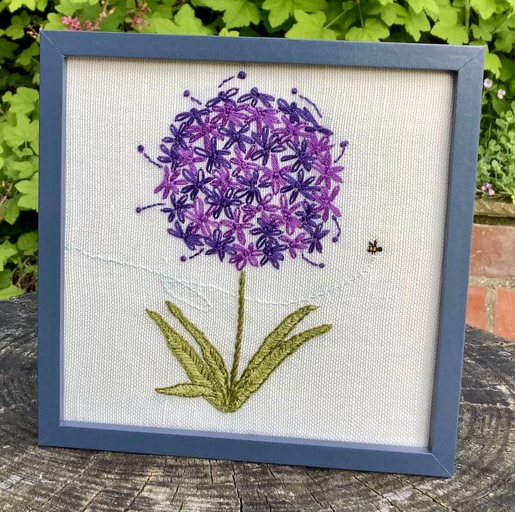 Framed Hand Embroidered picture of Allium flowers which display lovely round colourful blooms in the spring and go on to show attractive seedheads later in the year. Hand stitched in a vibrant purple colour to give the impression of the flower in bloom. It also depicts a small bee. The embroidery has been hand stretched before displaying in the frame. This picture measures 16.5cm square.