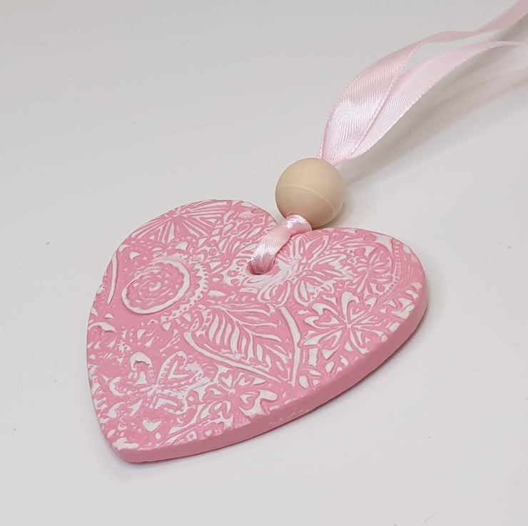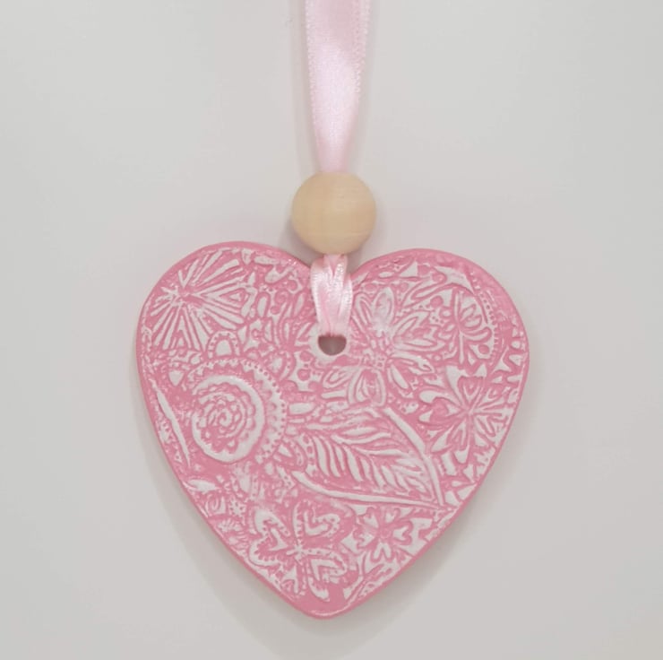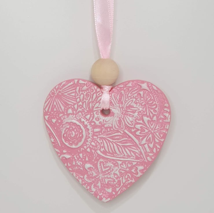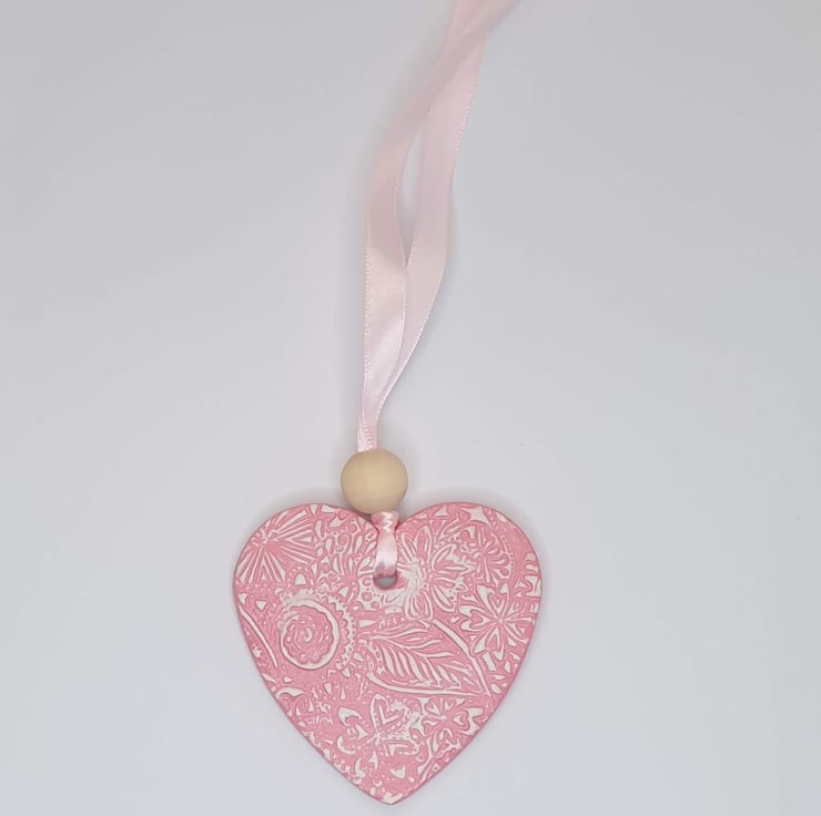 Pretty pink and white clay hanging heart decoration which has been handcrafted from air dry clay, embossed with a floral pattern on both sides, lightly sanded, painted and then varnished. This decorative heart would look lovely in any room of the house hung from a handle or knob or displayed in a window and comes ready to hang from pink satin ribbon finished with a wooden bead.