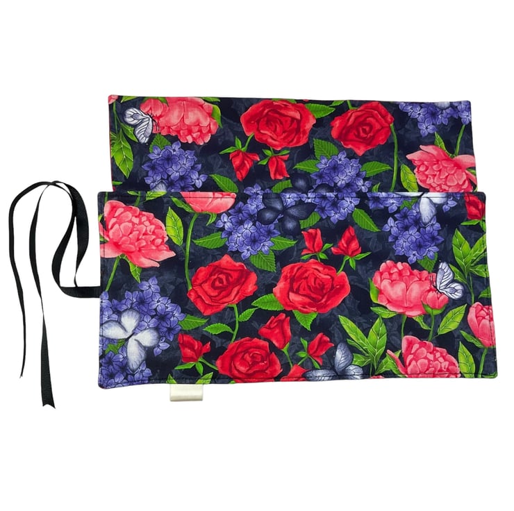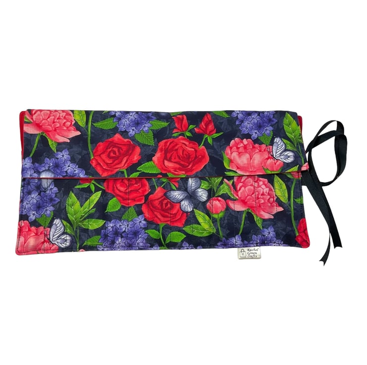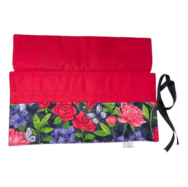 This beautiful floral and butterfly patterned fabric is the centrepiece of this crochet hook case, set on a black background. I have carefully paired it with a bright red for the lining, underside of the flap and upper needle pocket.
