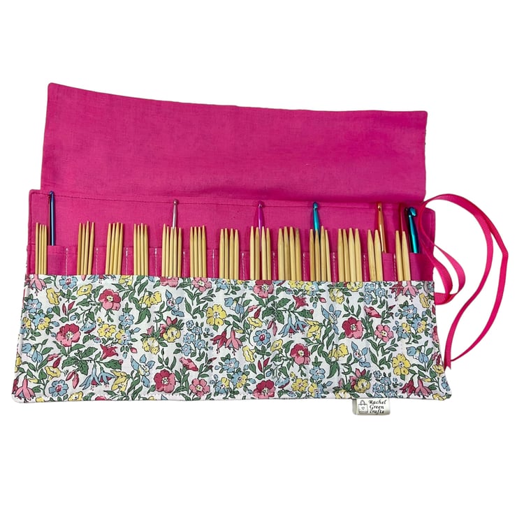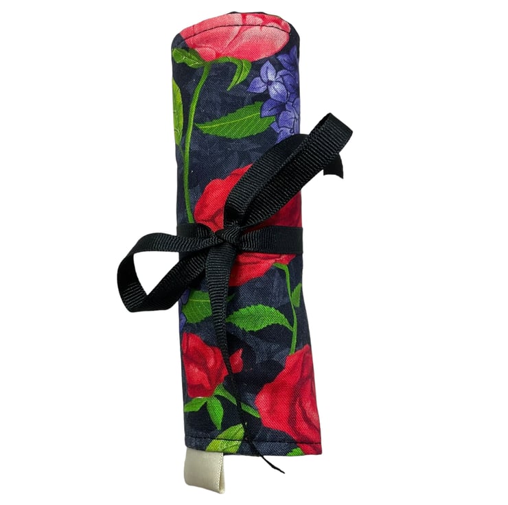 The needles are held in place with a flap Made in matching fabrics. The whole case neatly rolls up and fastens with a black grosgrain ribbon.