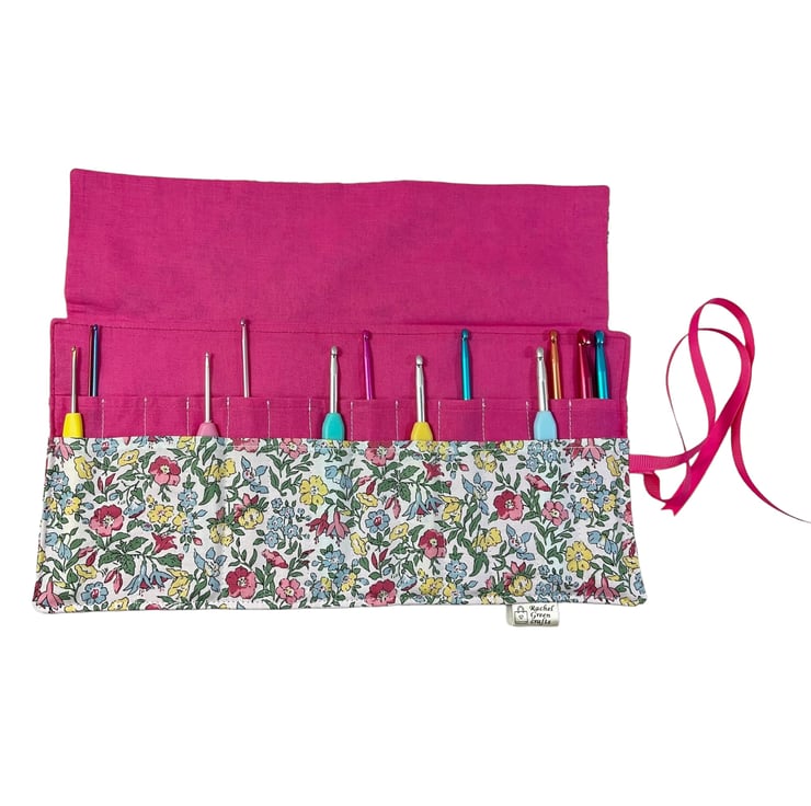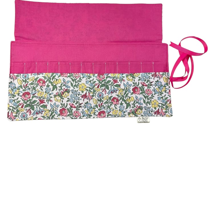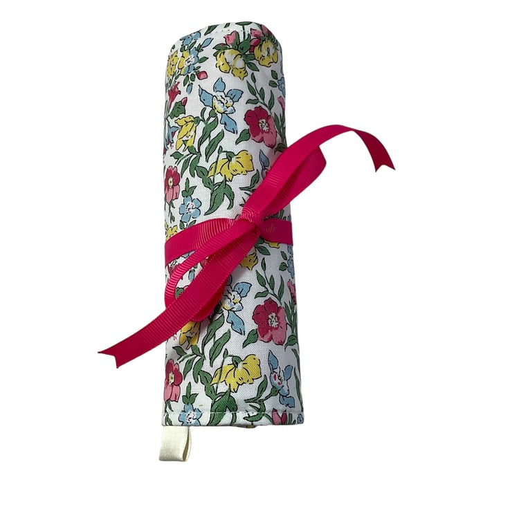 The needles are held in place with a flap made in matching fabrics. The whole case neatly rolls up and fastens with a pink grosgrain ribbon.