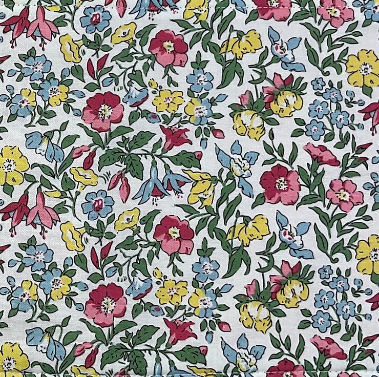 This case is made from The prettiest Liberty floral print Lasenby cotton which is a heavier weight than their tana lawn and therefore much more suitable for needle cases. This print is “Mamie” a pretty small floral print on an off white background. I have carefully paired it with cerise pink cotton for the lining, underside of the flap and upper needle pocket.