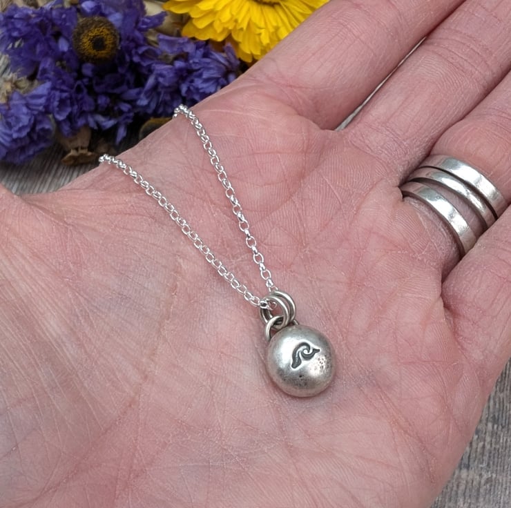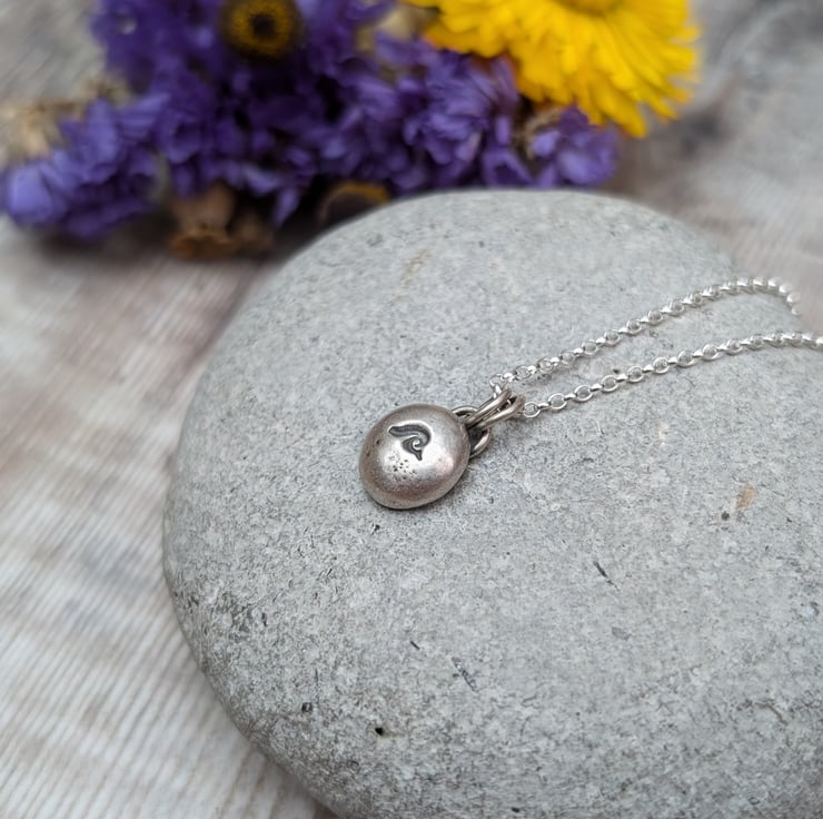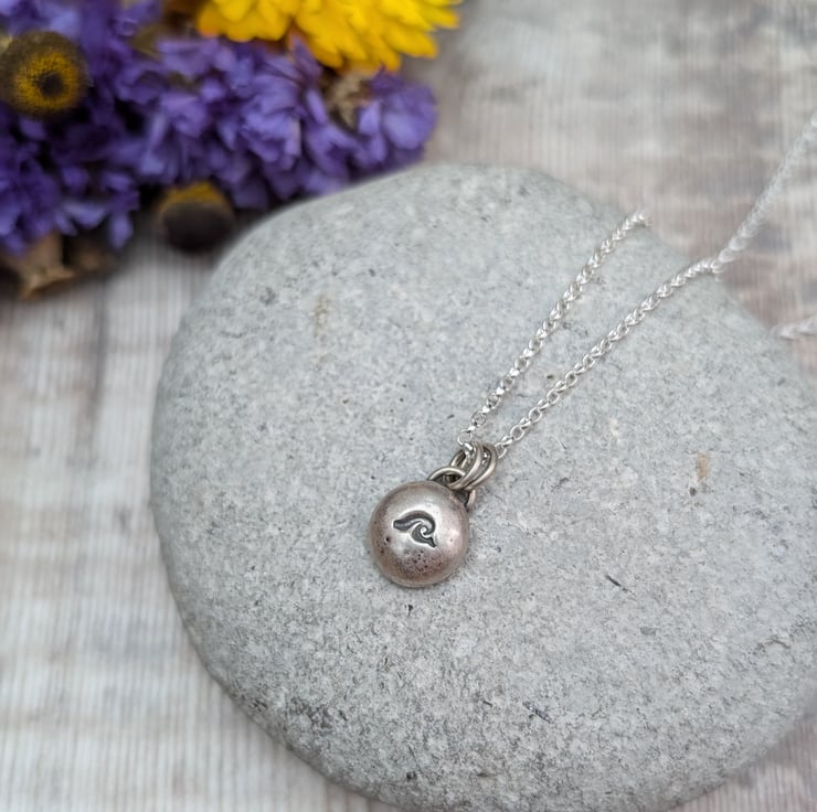 This sterling silver pebble necklace captures a simple, organic beauty with its softly rounded shape and gentle wave engraving. Handmade from recycled sterling silver in Bristol, UK, it brings a subtle, natural elegance to any outfit, whether worn alone or layered.