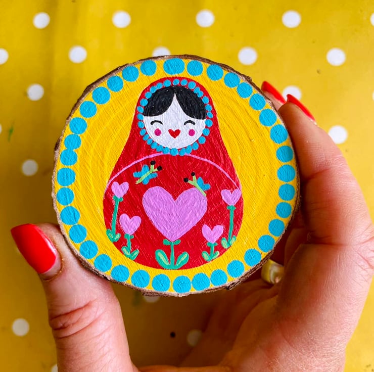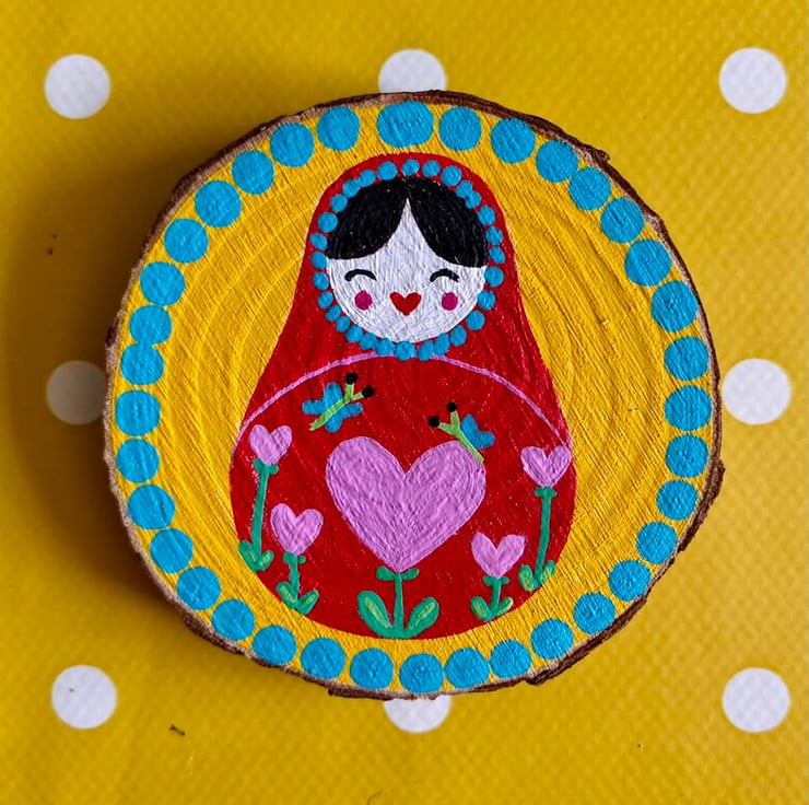 Sweet little hand painted rustic wooden slice, decorated with a gorgeous little folk art inspired nesting doll, a wee bit of magic right there!