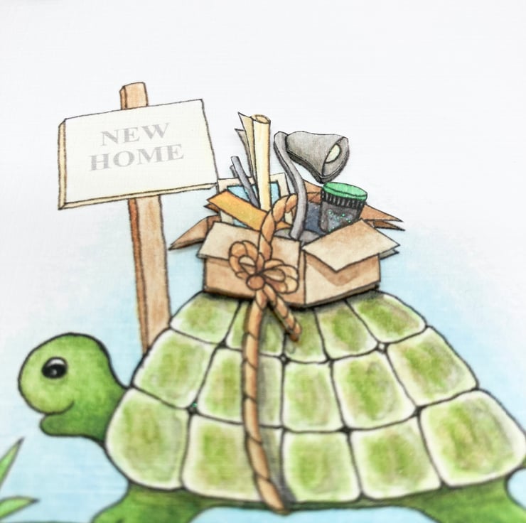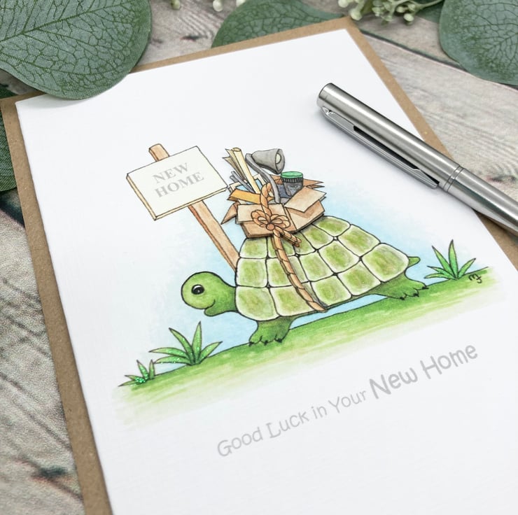 This cute Tortoise New Home card has been designed using my own original watercolour illustration. The card has been printed out onto good quality linen embossed card and hand finished with a little glitter detail. It also has a little 3d decoupage detail.