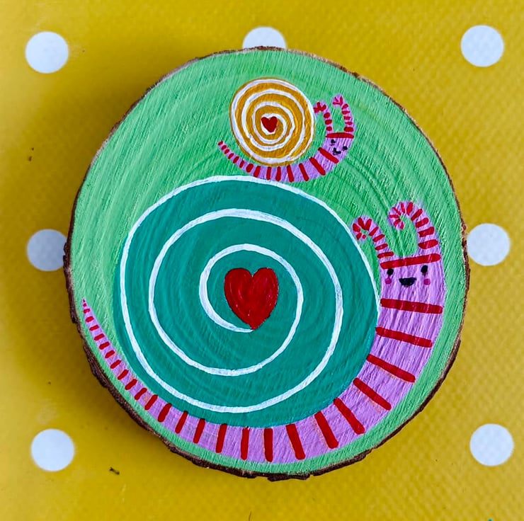 Sweet little hand painted rustic wooden slice, decorated with a mummy and a baby swirly snail , a wee bit of magic right there!