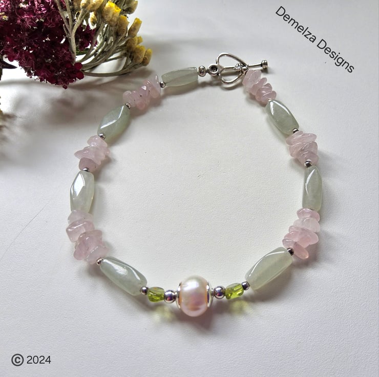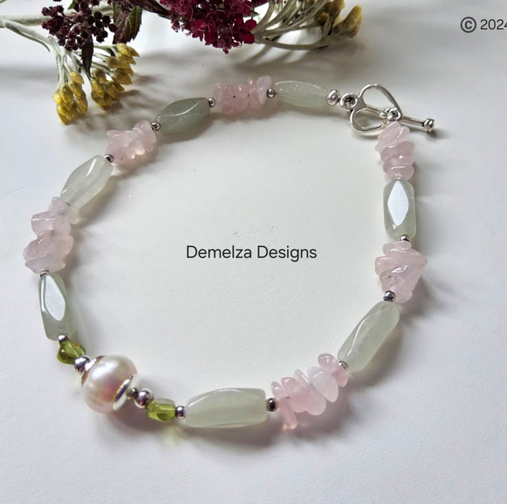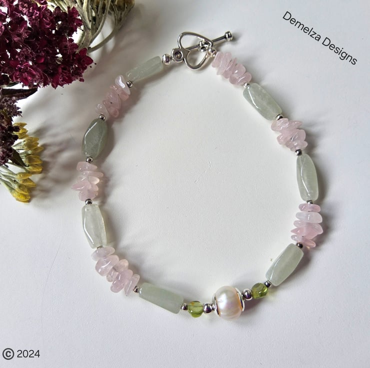 This bracelet has been designed and hand crafted in Cornwall using rose quartz nuggets, irregular shaped long green aventurine stones complimented with small peridot stones. In the centreis a 7mm freshwater culture pearl. Either side of the pearl are 6mm quality silver plated bead caps with 2.5mm silver plated spacer beads for added design detail. The clasp is a tibetan silver heart shape.