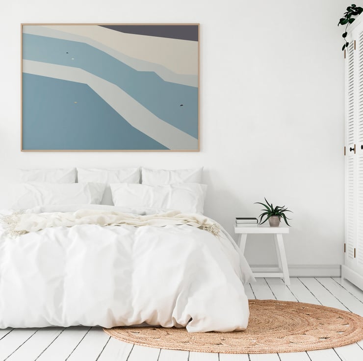 The "Swimmers" Contemporary painting is a stunning representation of the joy and freedom of summertime. This contemporary print features a dynamic composition of blues shades, capturing the essence of people swimming in the water. The use of lines and shapes creates a sense of movement and energy, while the intricate details invite the viewer to imagine the serene beauty of a hot summer day at the beach. Whether displayed in your living room, bedroom, office, or any other space, this "Swimmers" painting is sure to bring a touch of summertime and joy to your decor.