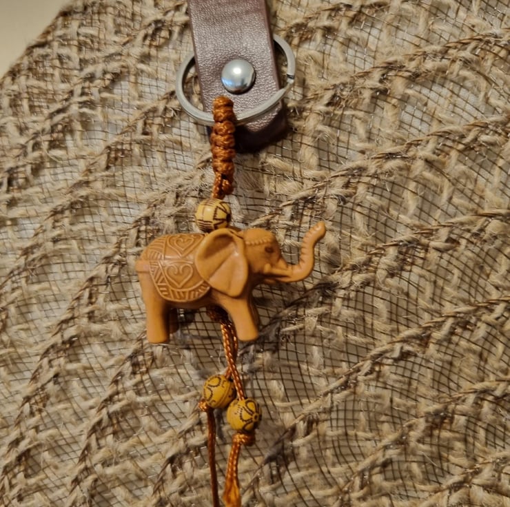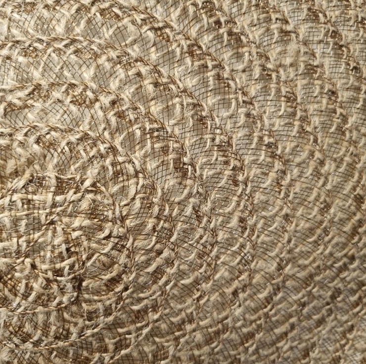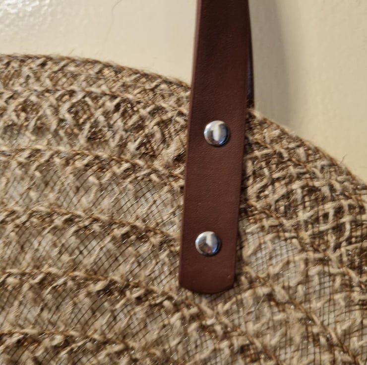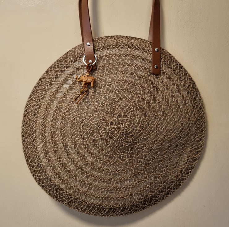 17” (38cm) Round Hessian brown, brown nylon thread, plain edge. Round placemat summer / beach / tote / everyday bag. Nylon thread has a slight shimmer runny all the way through. Fully lined in contrasting cream lining, 50% polyester / 50% cotton fabric. Dark brown faux leather handles with contrasting silver coloured studs / fixings. Small plastic elephant decoration. Measures 17” (38 cm) across / round. 60cm handles, hessian rope and wooden bead tassel. Shoulder bag, ideal, for festival, beach, summer, holidays, choice is yours. Narrow top opening for security.