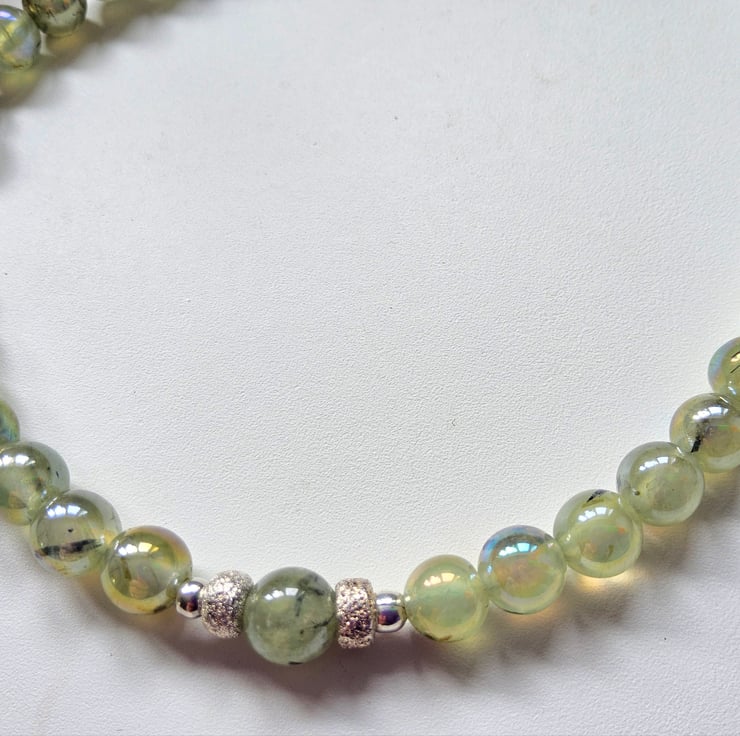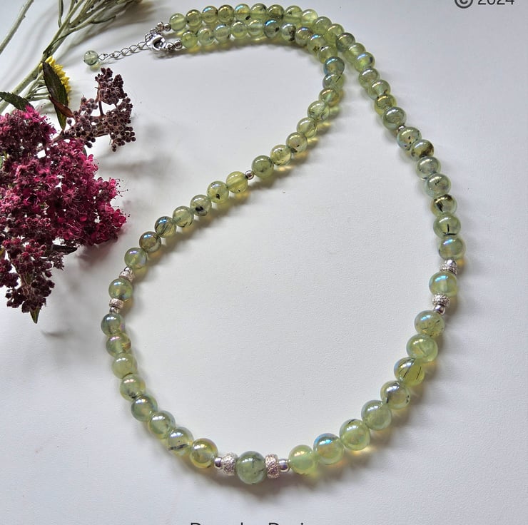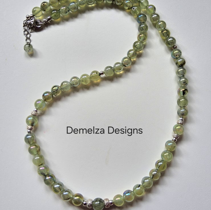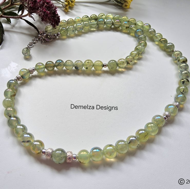 A beautiful simple sophisticated prehnite necklace designed and hand crafted in Cornwall by Demelza Designs. It has been created using 6mm smooth round cut gemstone beads. Within the design are brushed 925 sterling silver rondelles with smaller sterling silver beads to either side.