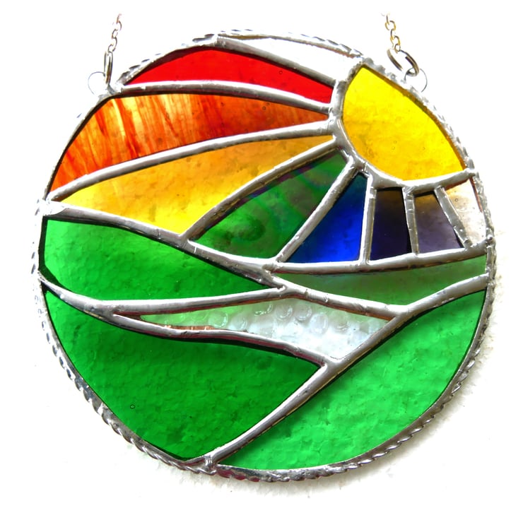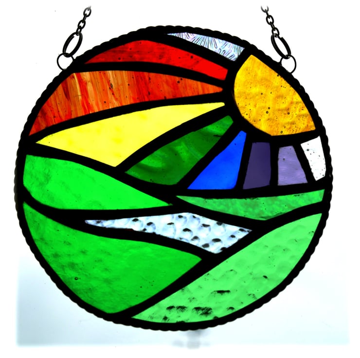 The sun's rays are a rainbow with, at either side a little piece of clear textured glass to let the sun through as that's how rainbows happen. Under the rainbow are green fields and a patch of sparkling water as the sun is shining on it.