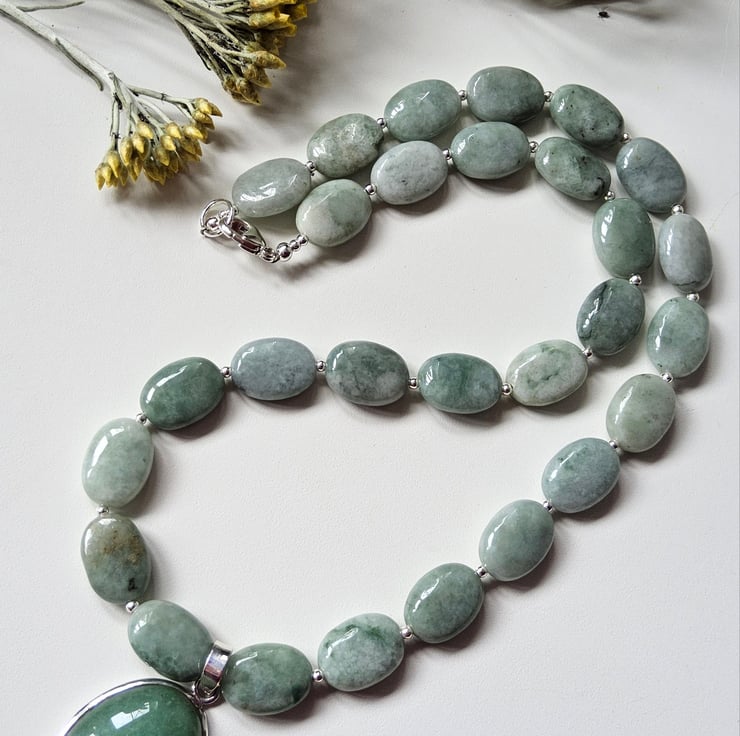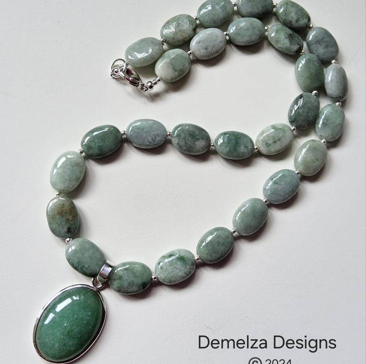 A beautiful sophisticated genuine burmese jadeite and green aventurine necklace designed and hand crafted in Cornwall by Demelza Designs. It has been created using 15mm by 10mm oval cut burmeese jadeite gemstone beads totalling 210cts in weight. In the centre is a large AA grade 3cm by 2cm green aventurine oval pendant with sterling silver surround. Between the gemstones are 2mm sterling silver beads for added sparkle.