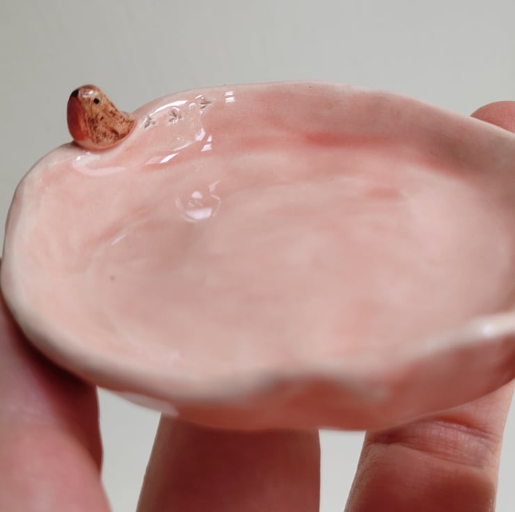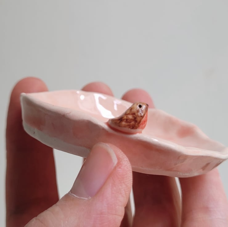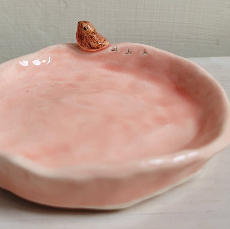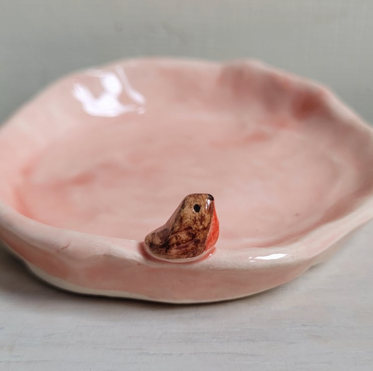 Hand pinched little pot from a small ball of clay . Once trimmed, the tiniest of handmade robins was attached, and bird prints were added prior to bisque firing . The robin was then hand painted, and the whole pot dipped in clear lead-free glaze prior to the final firing
