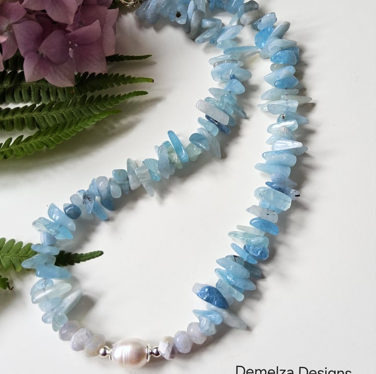 A beautiful sophisticated Brazilian Aquamarine, Blue Opal and Baroque Pearl necklace designed and hand crafted in Cornwall by Demelza Designs.
