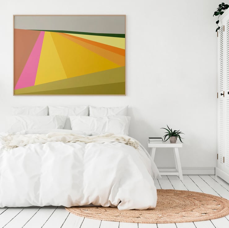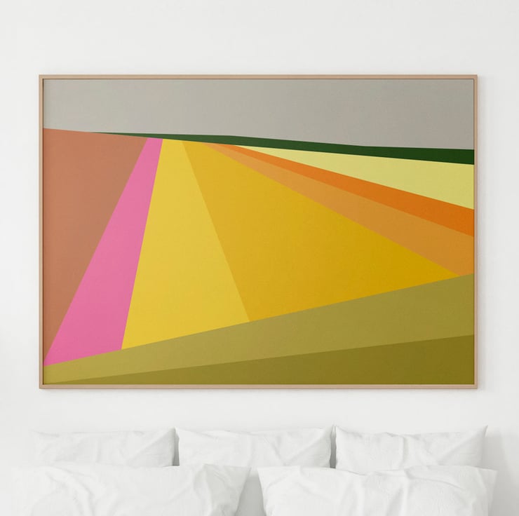This is a contemporary painting that features a unique geometric design that depicts an uphill landscape. The design showcases an abstract and modern interpretation of the ascent and may include shapes, lines, and colours that suggest the rising terrain and surrounding elements. The painting features different shades of colours to evoke the mood and atmosphere of the uphill journey.