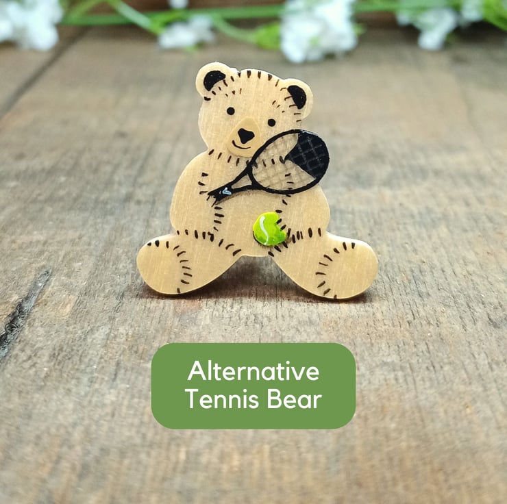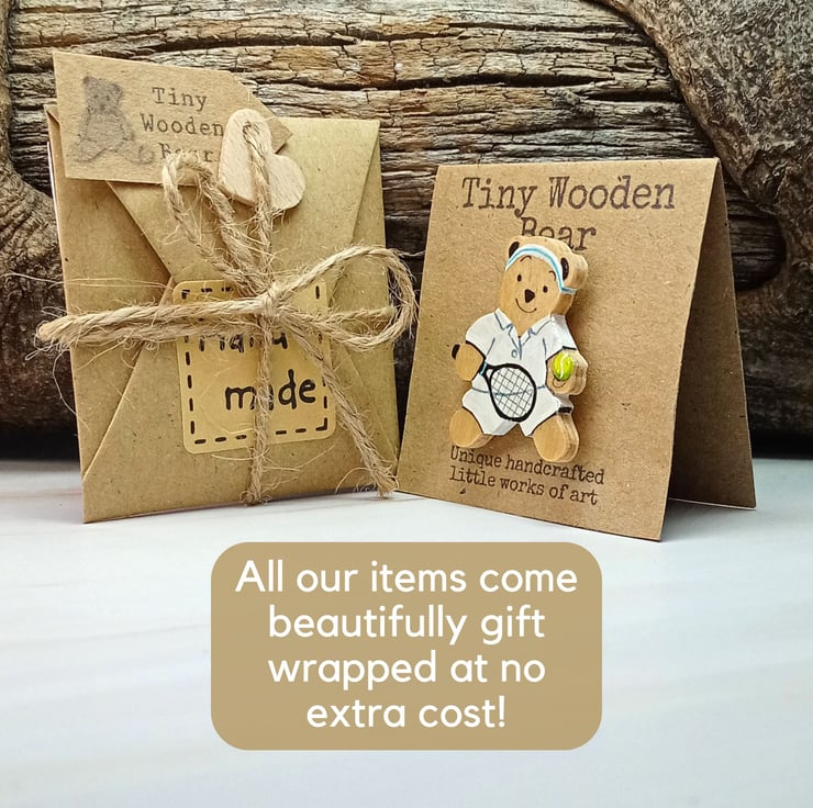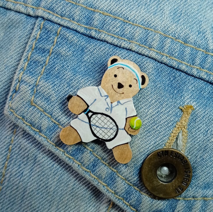 This handmade small teddy bear brooch pin has been hand crafted from wood and hand painted to achieve a totally unique gift for a tennis lover. Give it as a congratulations gift to a tennis player for winning a tournament, or to say thank you to a tennis coach. Perfect for pinning to a lanyard to make your colleagues smile! You can even have it personalised with a name or a short message on the back.