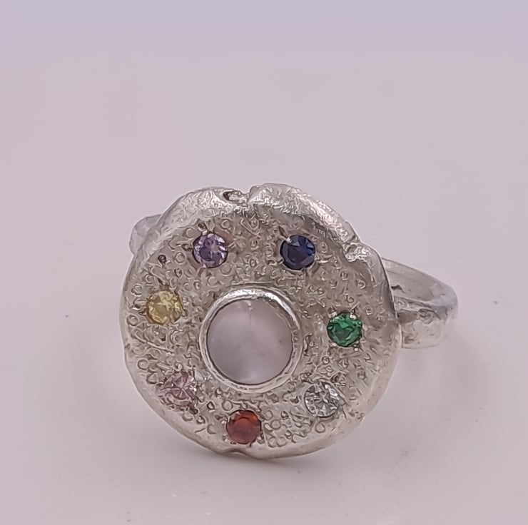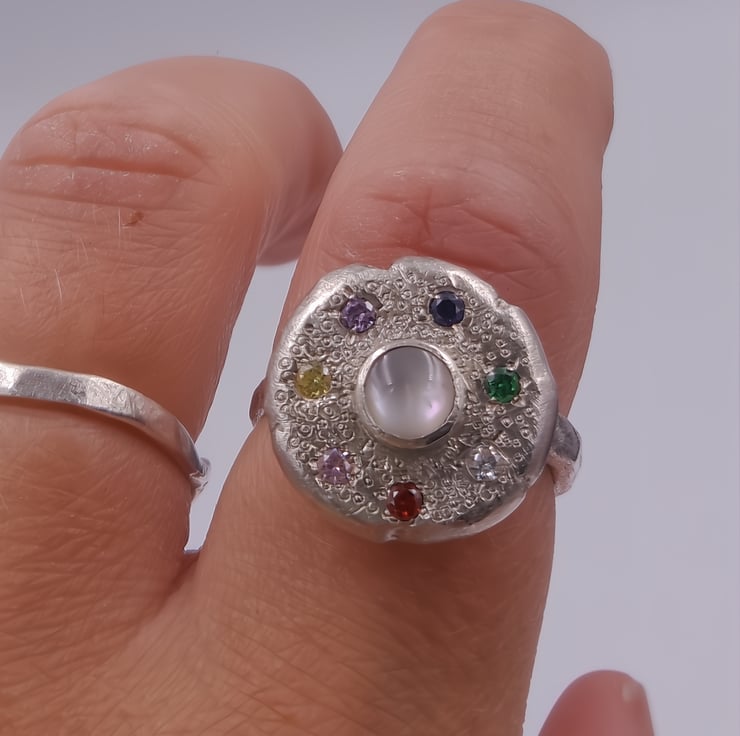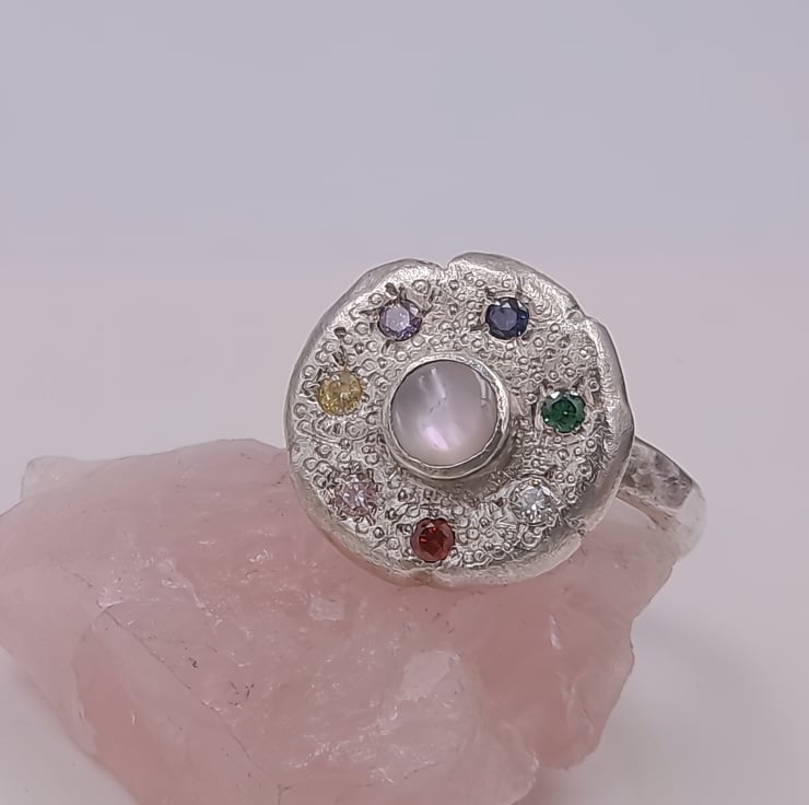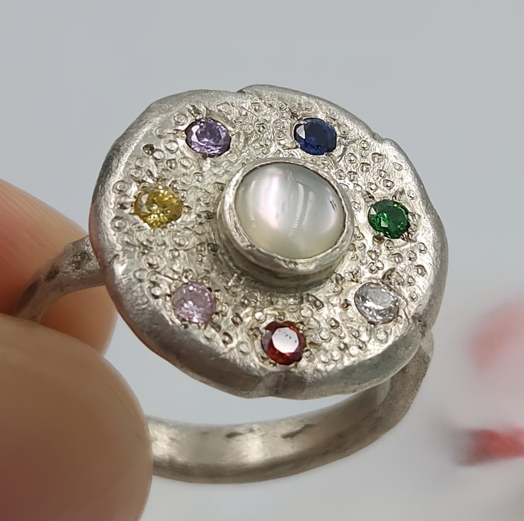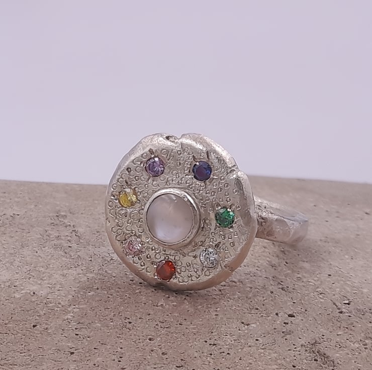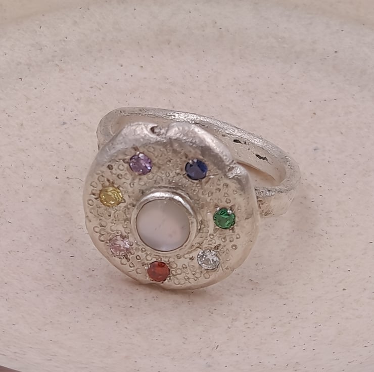 Introducing the Paint Palette Textured Silver Ring with Mother of Pearl, a fun and unique piece that combines artistic flair with timeless elegance. Crafted from molten silver, this ring features a uniquely textured band that showcases the beauty of handcrafted jewellery. At its centre lies a bezel set mother of pearl cabochon, exuding a soft, iridescent glow that captivates the eye. Encircling the cabochon are 2mm cubic zirconia gems, arranged in a vibrant paint palette effect that adds a touch of sparkle and colour. This ring is the perfect blend of rustic charm and sophisticated design, making it a standout addition to any jewellery collection.