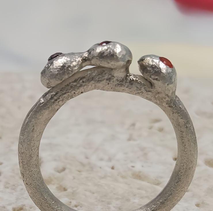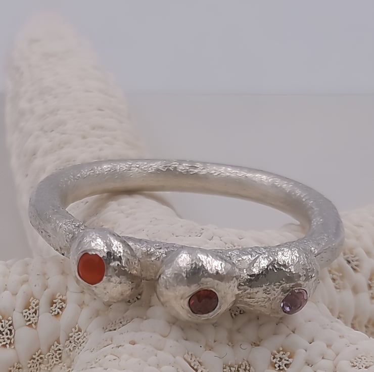 Introducing the Molten Silver Granule Ring, a striking piece that combines raw elegance with vibrant colour. This handcrafted ring is forged from molten silver, featuring a distinctive granule design that exudes an organic, textured beauty. Each of the three granules is set with a different gemstone: a fiery carnelian, a deep red garnet, and a stunning rhodolite garnet. The harmonious blend of these gemstones creates a captivating visual effect, making this ring a perfect statement piece for those who appreciate unique, artisanal jewellery.