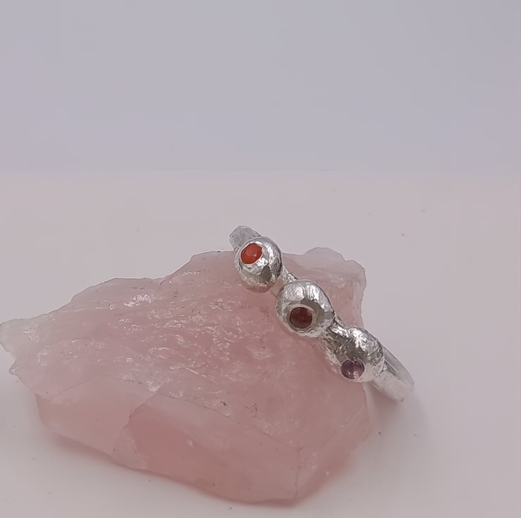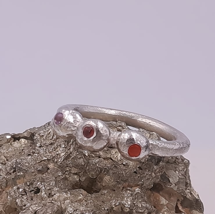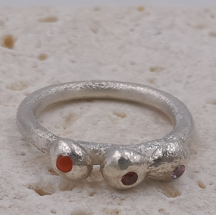 Molten Silver Granule Ring with Carnelian, Garnet, and Rhodolite Garnet
