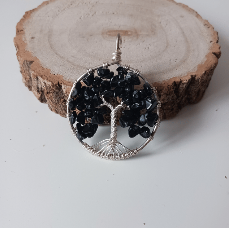 This handcrafted Tree of Life necklace is made with meticulous detail using silver tone wire and striking black onyx stones. With a pendant size of approximately 2.5 inches and a 20-inch chain, this piece is a perfect addition to any jewelry collection. Ready for immediate shipping.