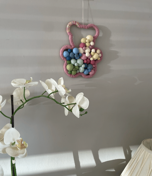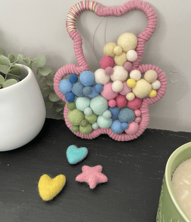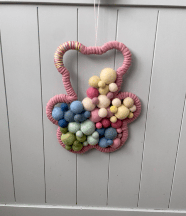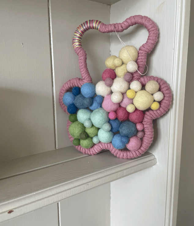 Handmade 100% marino wool have been carefully arranged inside a macrame cord wrapped wooden teddy shape to create this design in my Kent studio.
