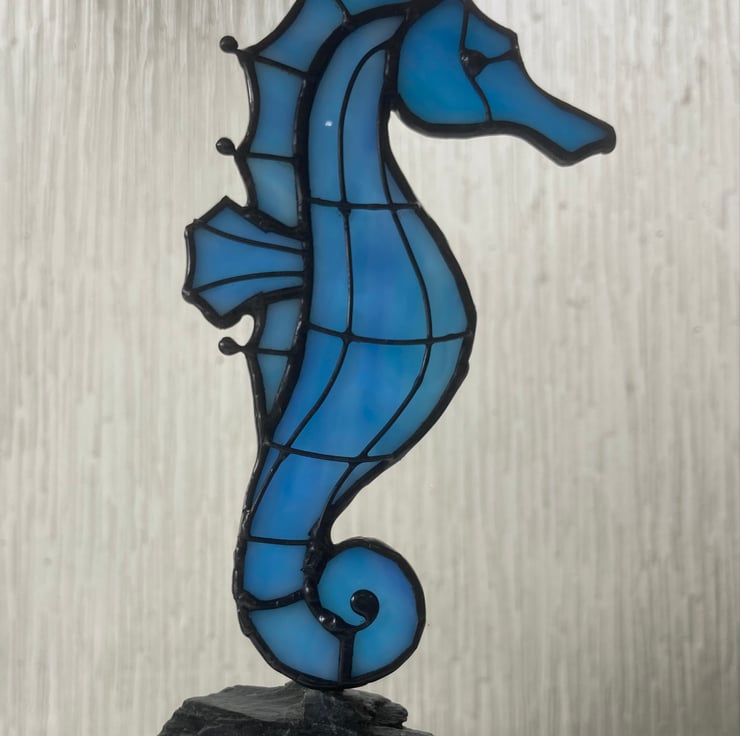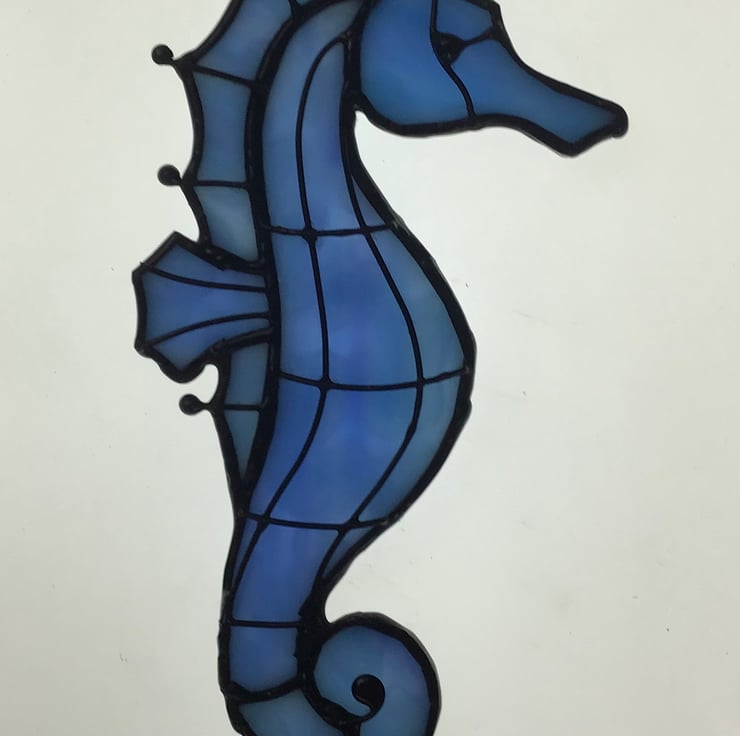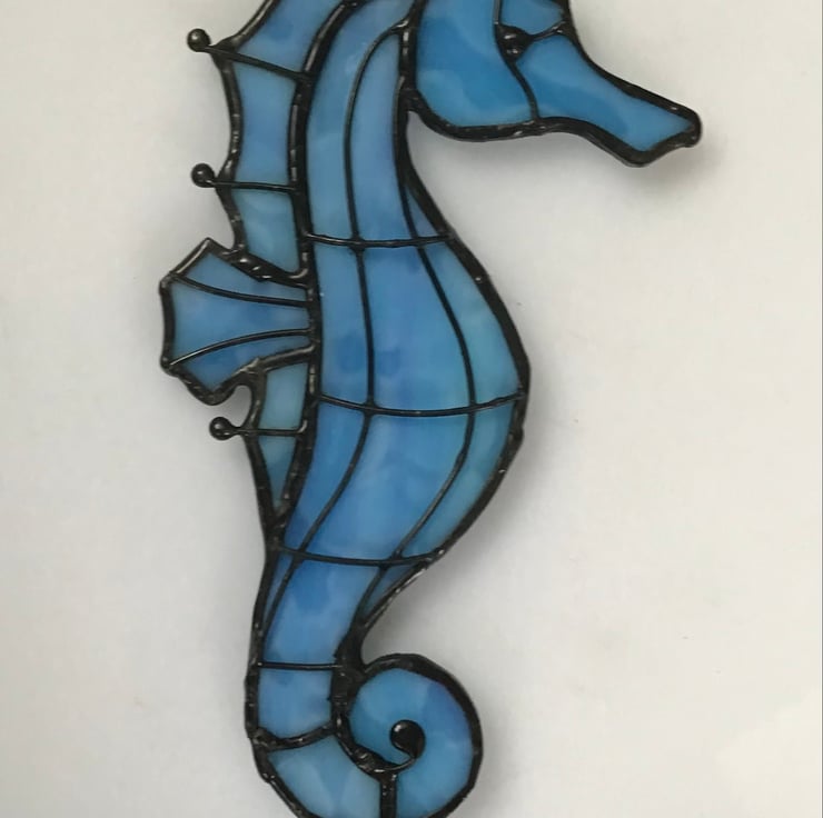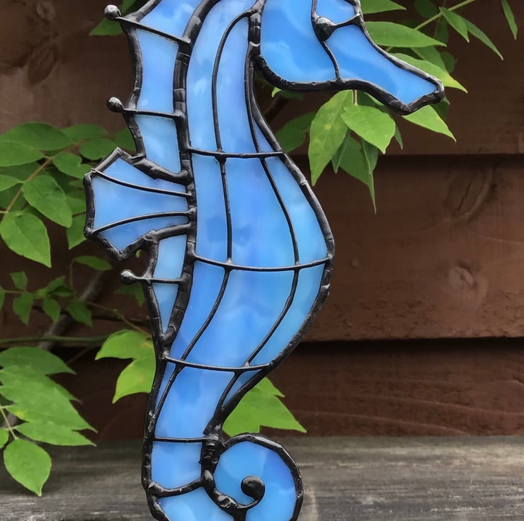 I love seahorses. This beautiful opaque pale blue glass really screamed to become a seahorse.