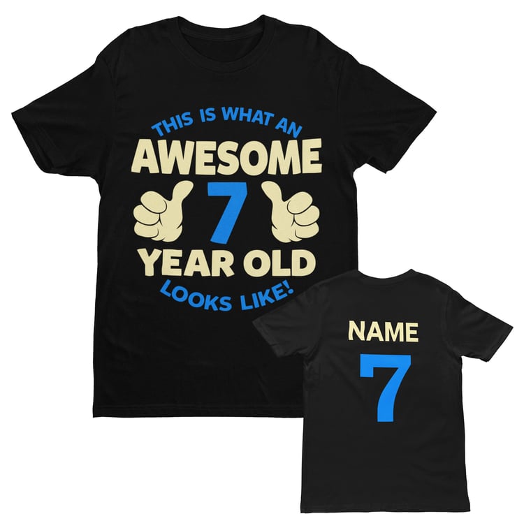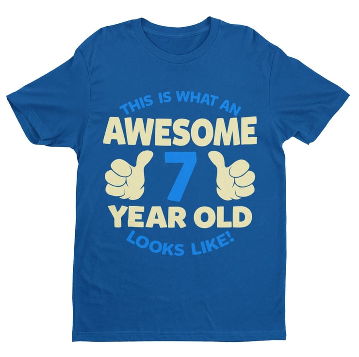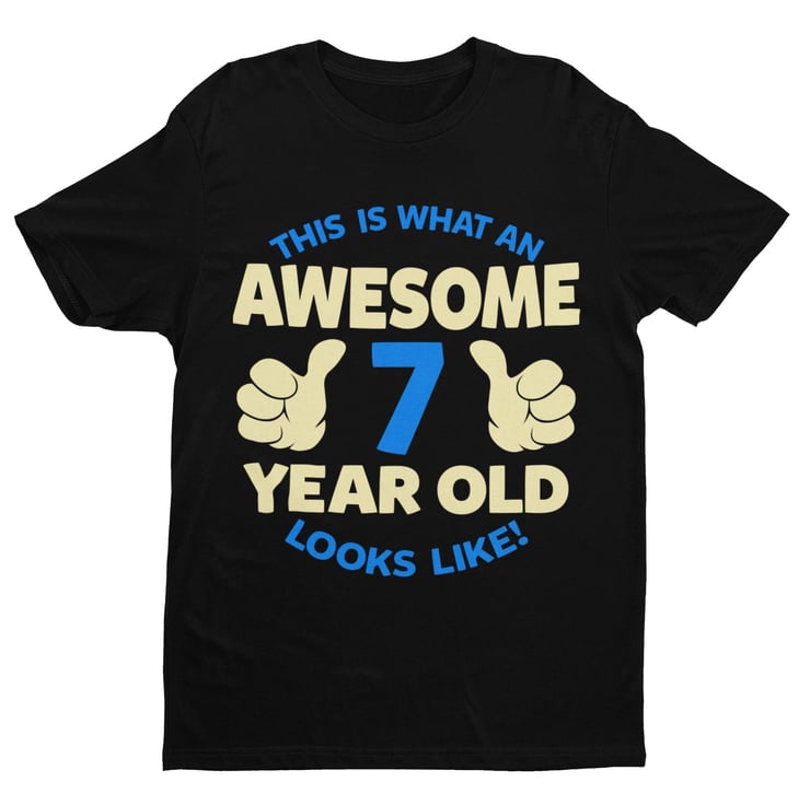 PERSONALISED Boys 7th Birthday T Shirt This Is What An Awesome 7 Year Old Looks Like with pointing thumbs design 7th birthday gifts. No seventh birthday is complete without the customary birthday t shirt and every 7 year old will love this one with the pointing thumbs design, make the big day extra special and a birthday full of fun and excitement and have the little man looking amazing for his 7th birthday party. Available in four colours and three sizes 56 and 78 and 910 for 7 year olds of every shape and size. Expertly printed with care and attention to detail in the UK for vibrancy and durability.