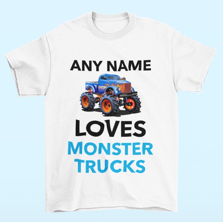 Get them revved up with this personalized monster truck t-shirt! Let their name take the spotlight alongside a bold and bright monster truck graphic. Crafted from 100% cotton, this comfy crew-neck tee lets them proudly show off their name and their love for big trucks, 4x4s and all things off-road. Perfect for playtime or as a personalized gift, this customizable kids' tee is a surefire hit for any young monster truck fan or rally racing enthusiast. Just pick their name and get ready to see their face light up!