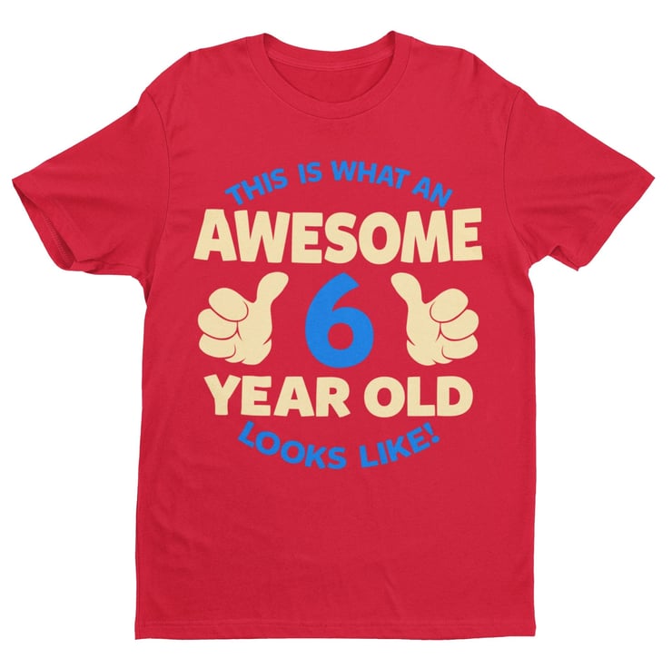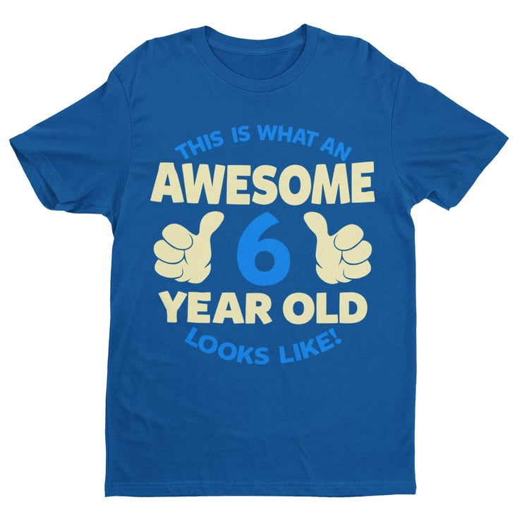 PERSONALISED Boys 6th Birthday T Shirt This Is What An Awesome 6 Year Old Looks Like with pointing thumbs design 6th birthday gifts. No six birthday is complete without the customary birthday t shirt and every 6 year old will love this one with the pointing thumbs design, make the big day extra special and a birthday full of fun and excitement and have the little man looking amazing for his 6th birthday party. Available in four colours and three sizes 34 , 56 and 78 for 5 year olds of every shape and size. Expertly printed with care and attention to detail in the UK for vibrancy and durability.