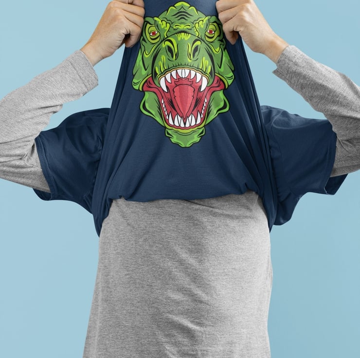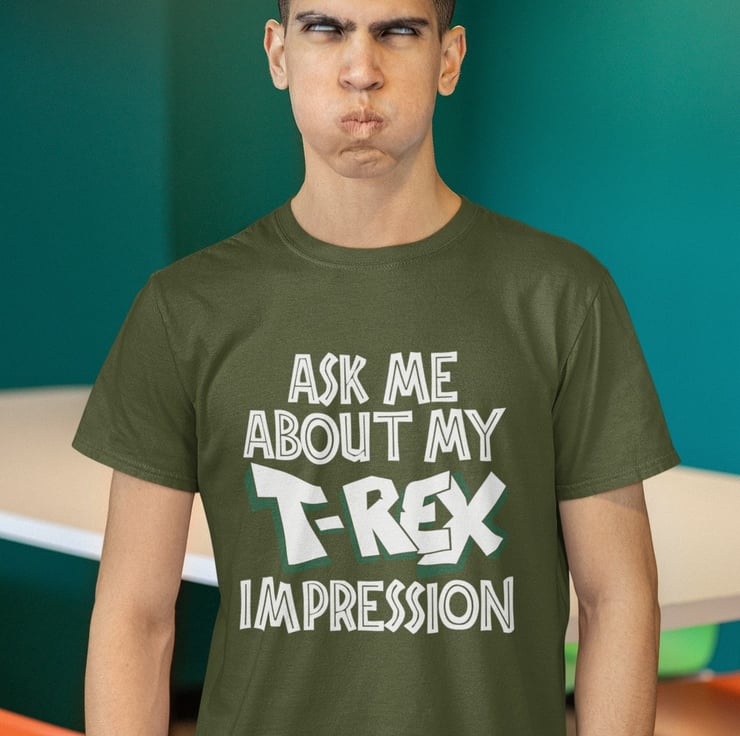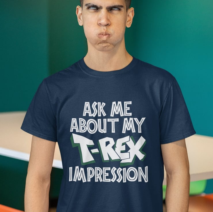 Flip T Shirt Ask Me About My T-Rex Impression , hilarious joke t shirt, simply pull the bottom over your head to complete the disguise. Great self send up and brilliant gift idea, this joke never stops being funny. Magnificent addition to the wardrobe whether it's for yourself or that jokey friend. Available in three colours, black, midnight navy and in nine sizes. Expertly printed on a short sleeved, crew neck, soft cotton classic tee.