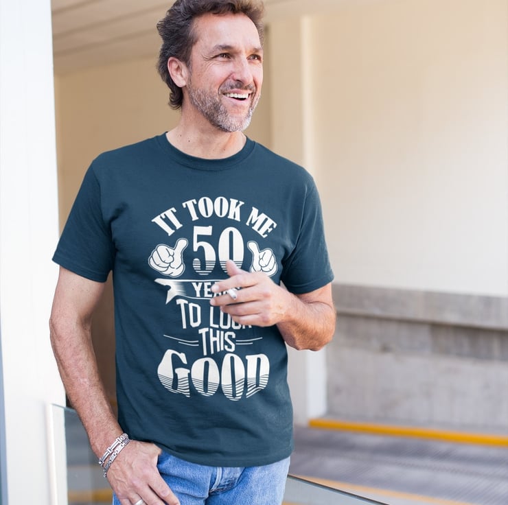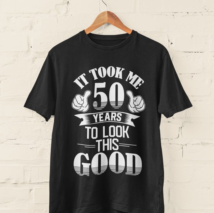 Introducing our exclusive 50th Birthday T-Shirt, the epitome of style and wit for your milestone celebration! With its cheeky "Took Me 50 Years to Look This Good" slogan accompanied by playful pointing thumbs, this tee is guaranteed to turn heads and spark conversations. Available in classic black, sophisticated midnight navy, and rugged military green, choose your favorite hue to match your personality. Crafted with meticulous attention to detail, our t-shirt offers both comfort and quality, ensuring you feel confident and stylish on your special day. From size small to 6XL, we cater to all shapes and sizes, because everyone deserves to look and feel their best. Whether you're gathering with loved ones or hitting the town, this versatile tee is the perfect addition to your birthday ensemble. Elevate your celebration with our premium 50th Birthday T-Shirt and show the world that age is just a number!
