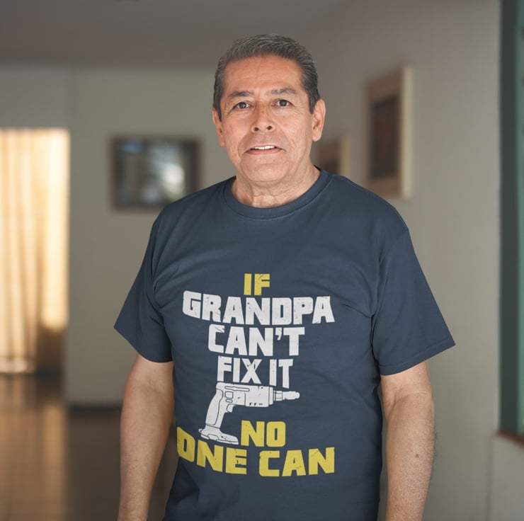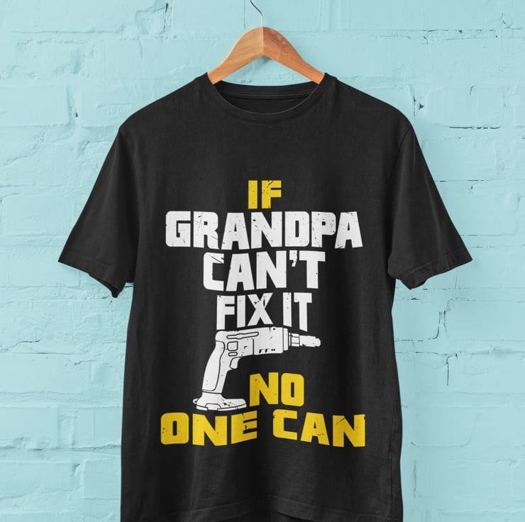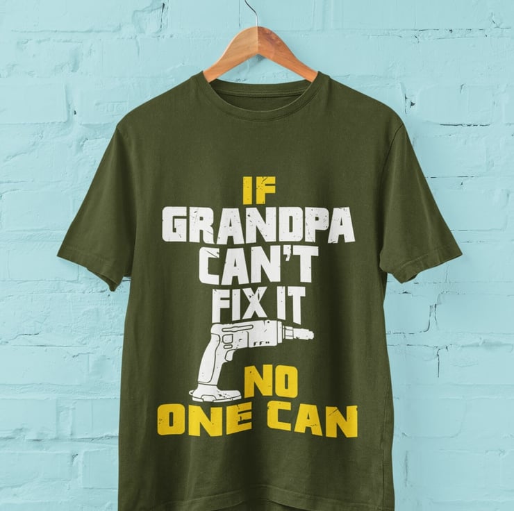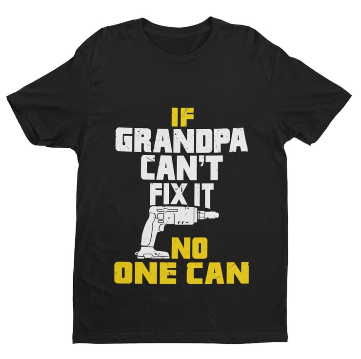 Funny Grandpa T Shirt If Grandpa Can't Fix It No One Can. Superbly set out artwork with gun graphic, this funny top makes this a cracking gift idea for Grandpas everywhere, with pointing thumbs design.Also available in Grampa, Grandad and Papajust let me know if you need any of these Available in three colours, black, midnight navy and military green and in nine sizes. Expertly printed, using state of the art digital technology for the perfect finish and durability on a short sleeved, crew neck, soft cotton classic tee.
