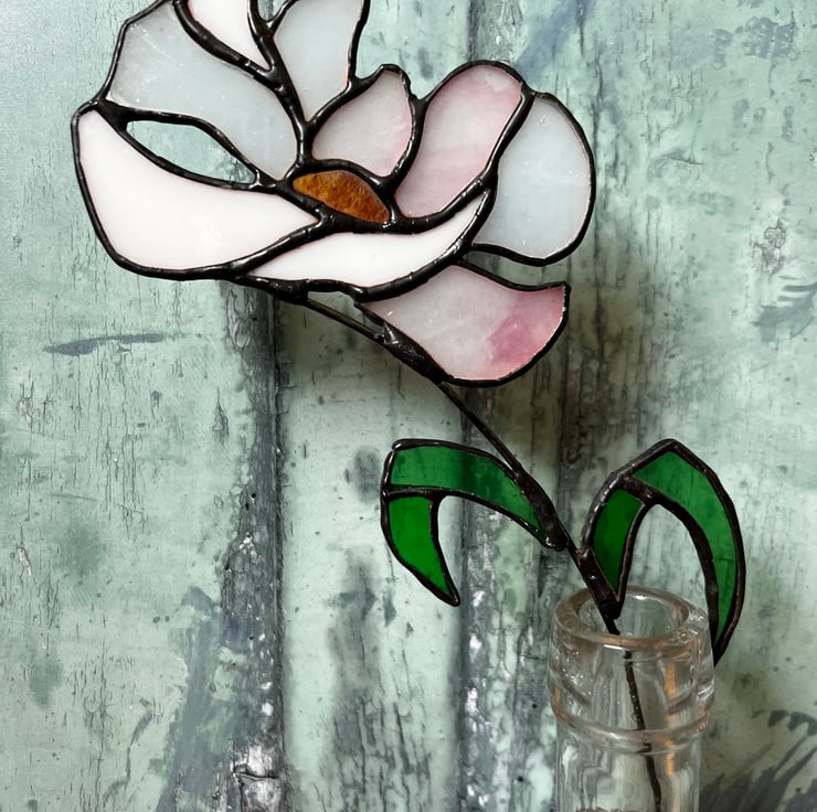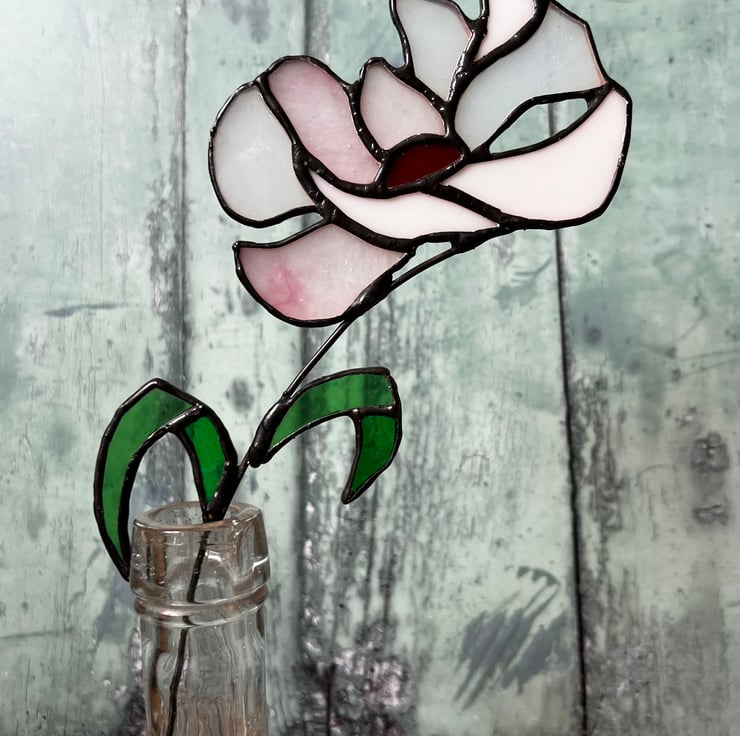 A pale pink opal and white opaque stained glass flower with two toned transparent leaves and a shiny black patina. A red iridescent flower centre adds something extra special to this flower.