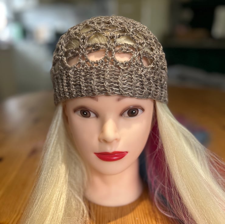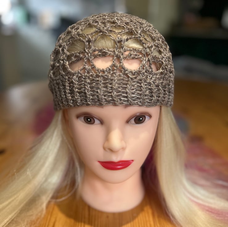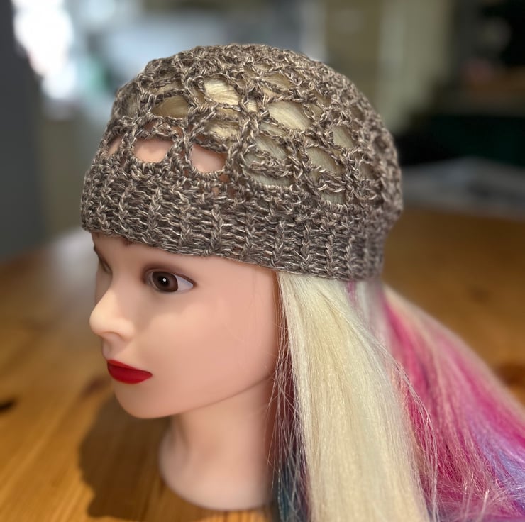 Made with lovely brown wool yarn, to fit 21in head